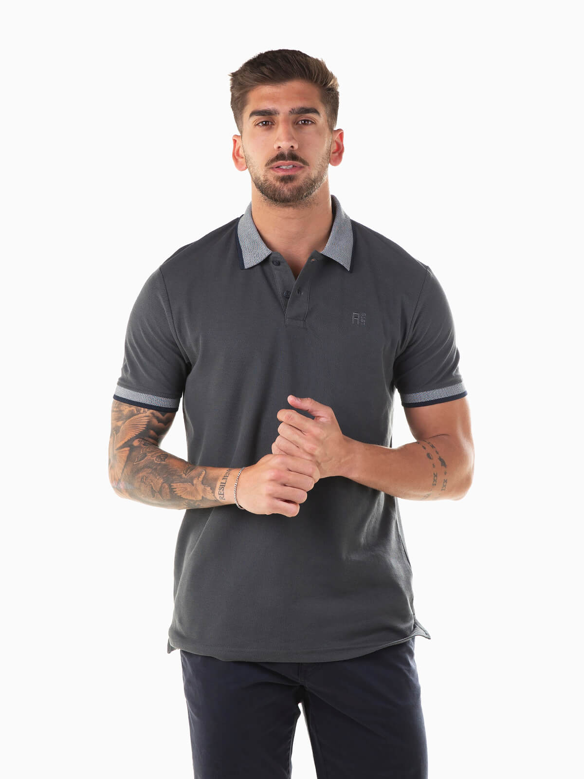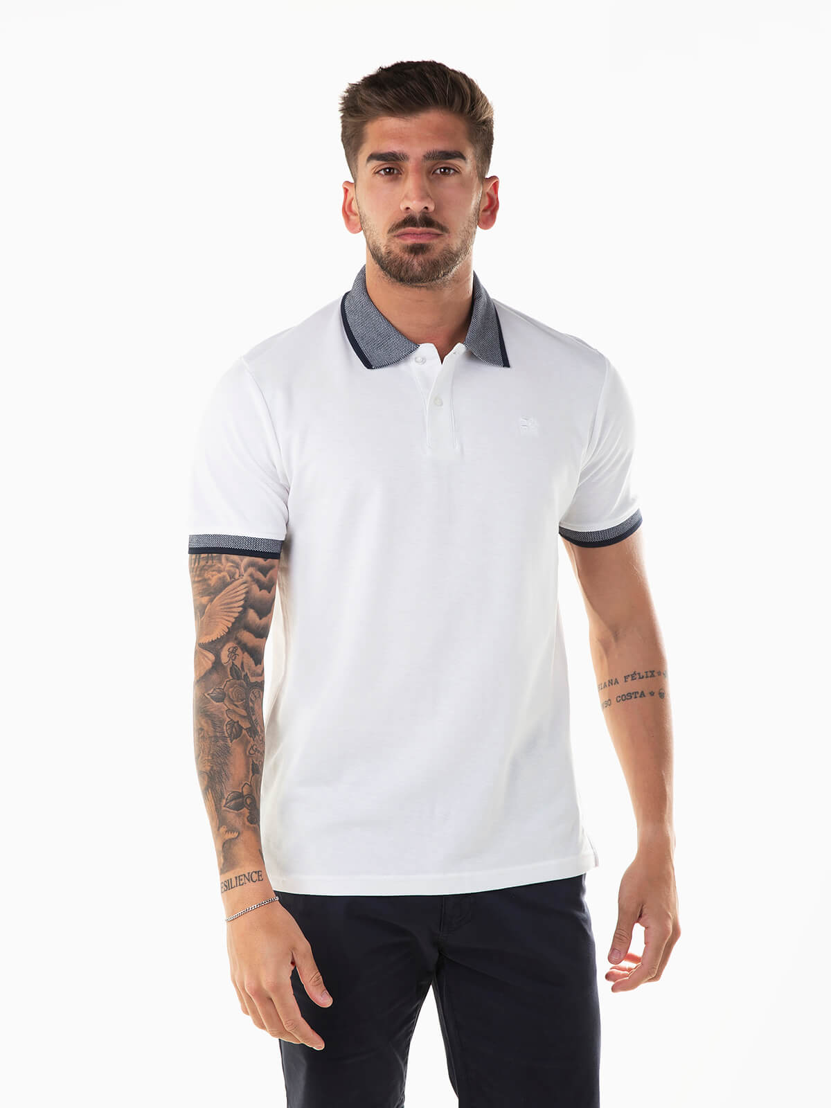 Polo de manga curta combinado com extremidades mescladas. Polo piqué para homem com símbolo bordado no peito e gola de abas. Carcela reforçada com 2 botões.