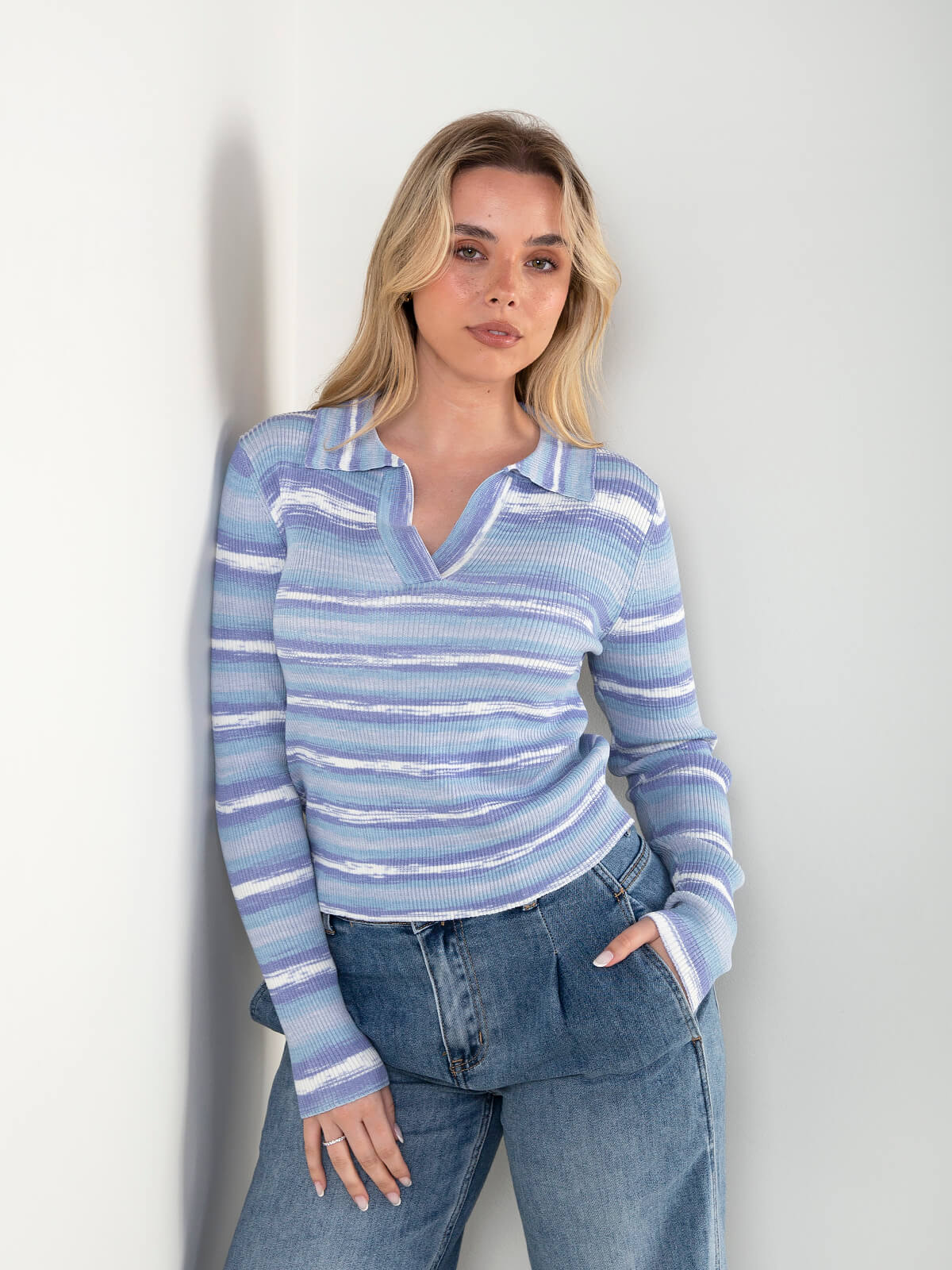 Polo de malha canelada às riscas com gola e manga comprida. Confortável e atual. Usa com jeans de cintura alta ou calças de alfaiataria.