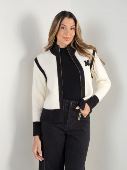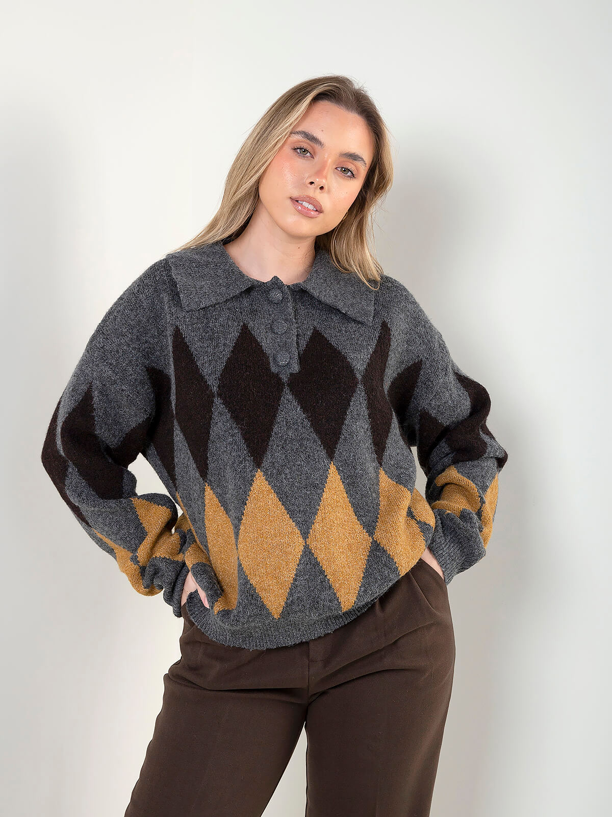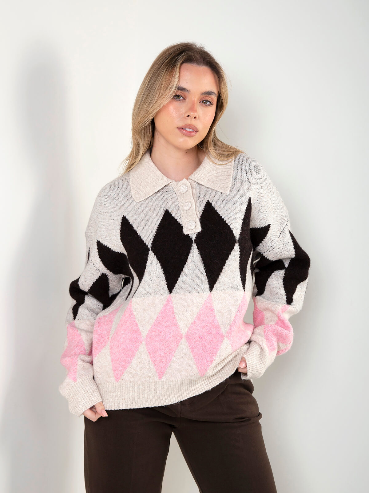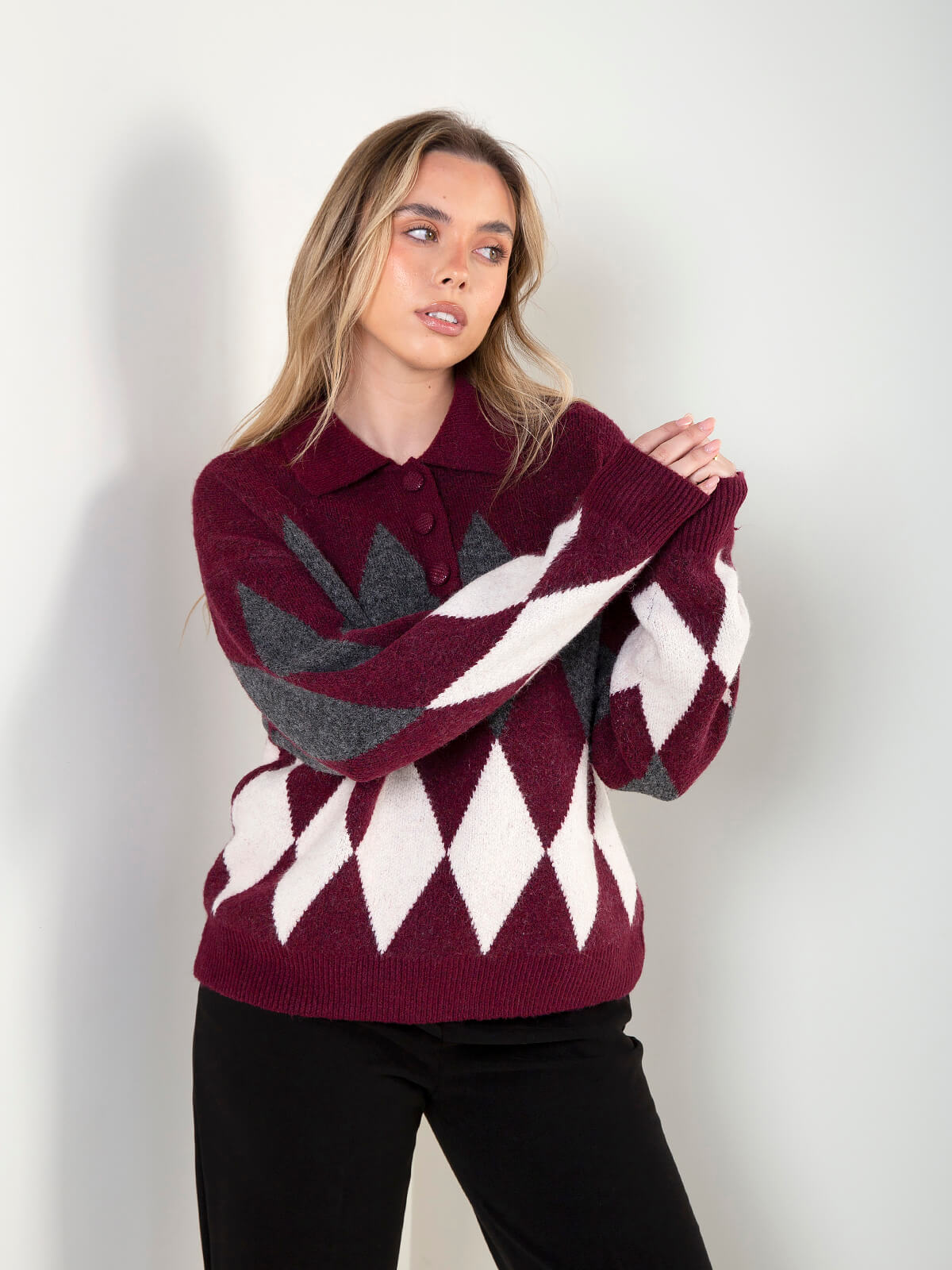 Polo de malha com padrão de losangos em contraste, gola polo com botões e manga comprida. Modelo confortável para mulher ideal para looks de inverno do dia a dia.