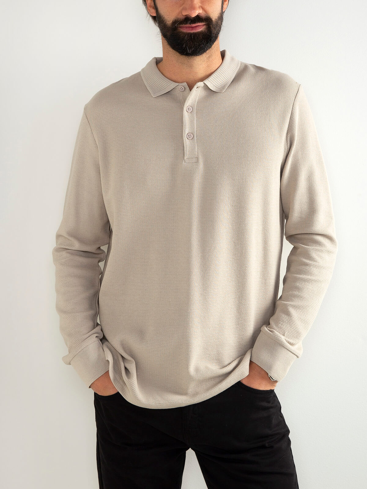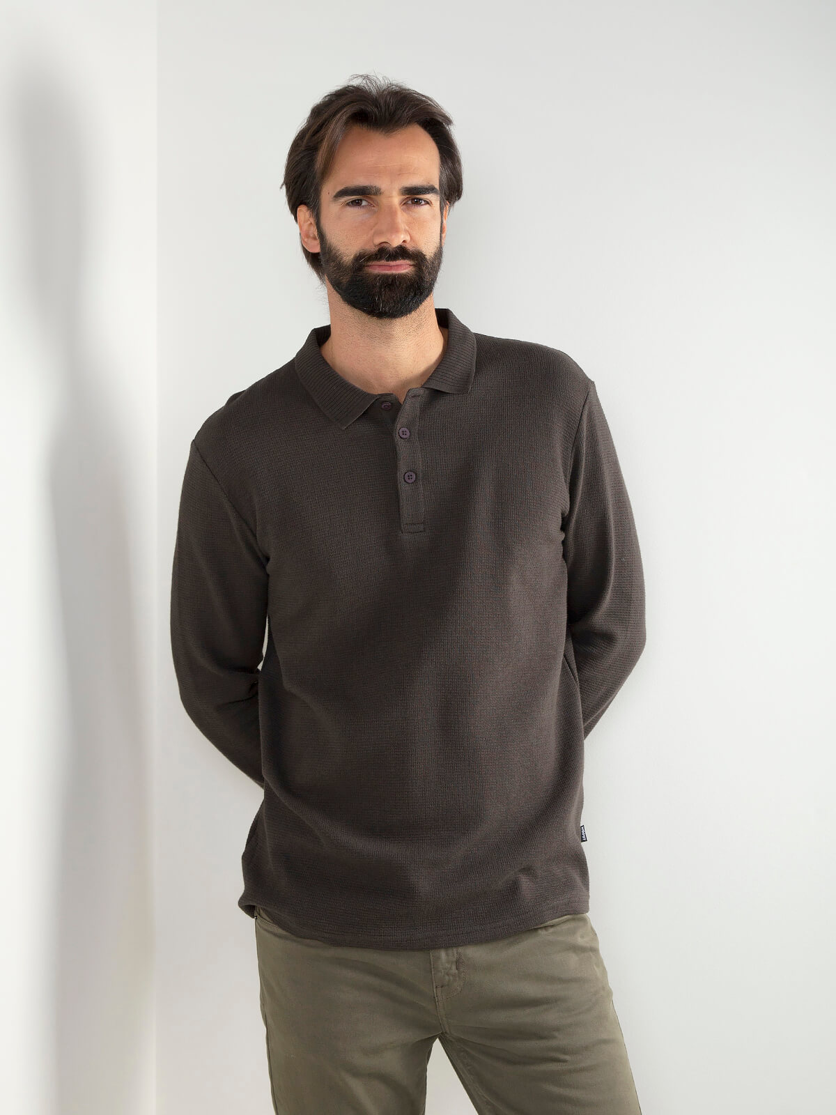 Polo de malha estruturada com manga comprida e colarinho clássico. Aperta com três botões e tem um toque confortável, perfeito para looks simples e arrumados.