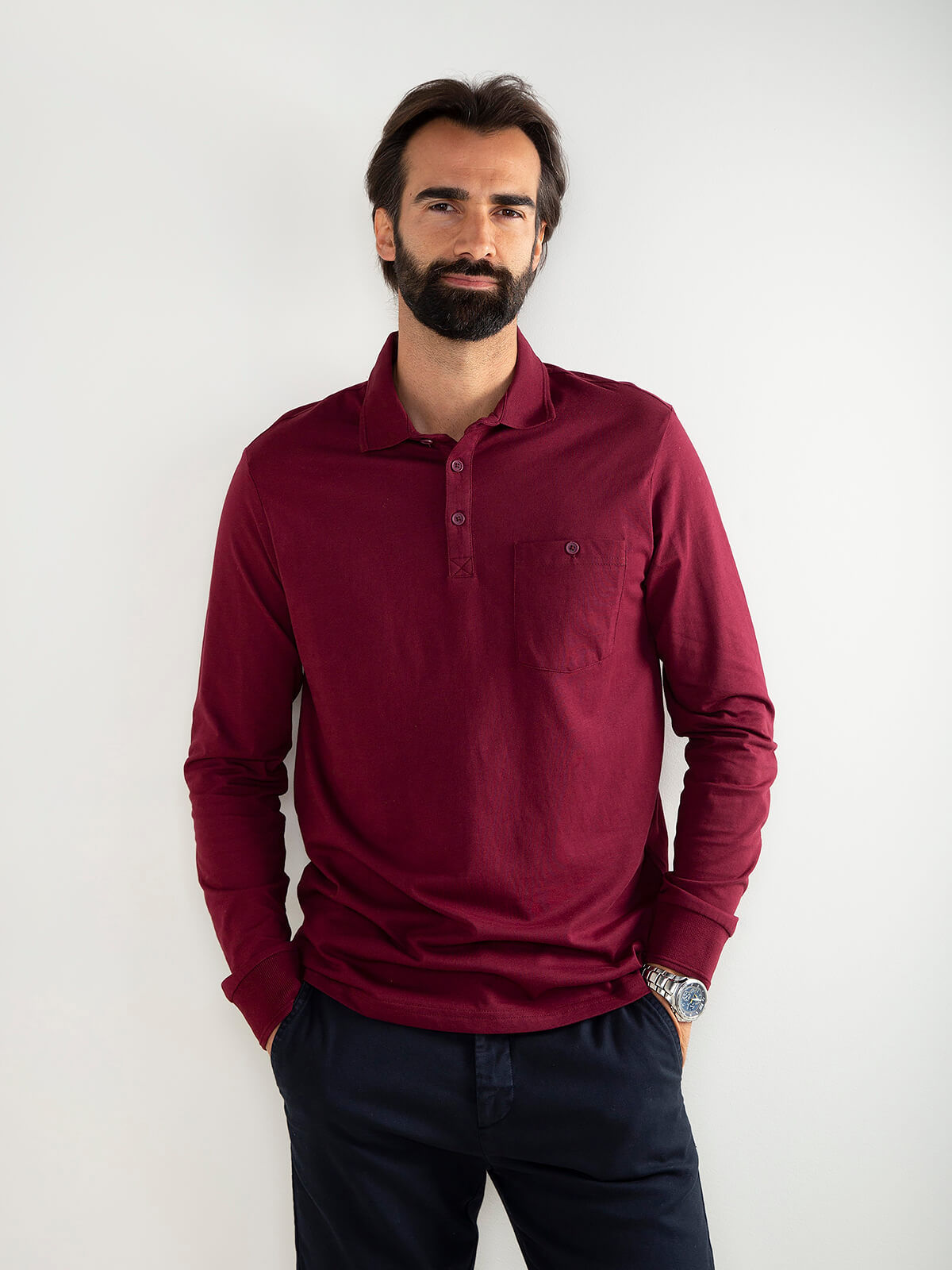 Polo de malha 100% algodão com manga comprida, carcela de três botões e bolso no peito. Confortável, versátil e perfeito para o dia a dia.