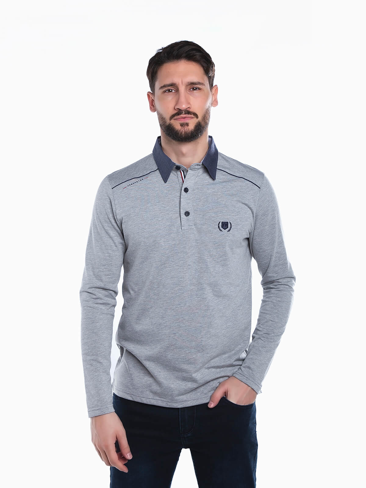 Polo de manga comprida com gola em ganga para homem. Polo cardado com símbolo bordado no peito. Carcela reforçada com 3 botões. Aberturas laterais na base.