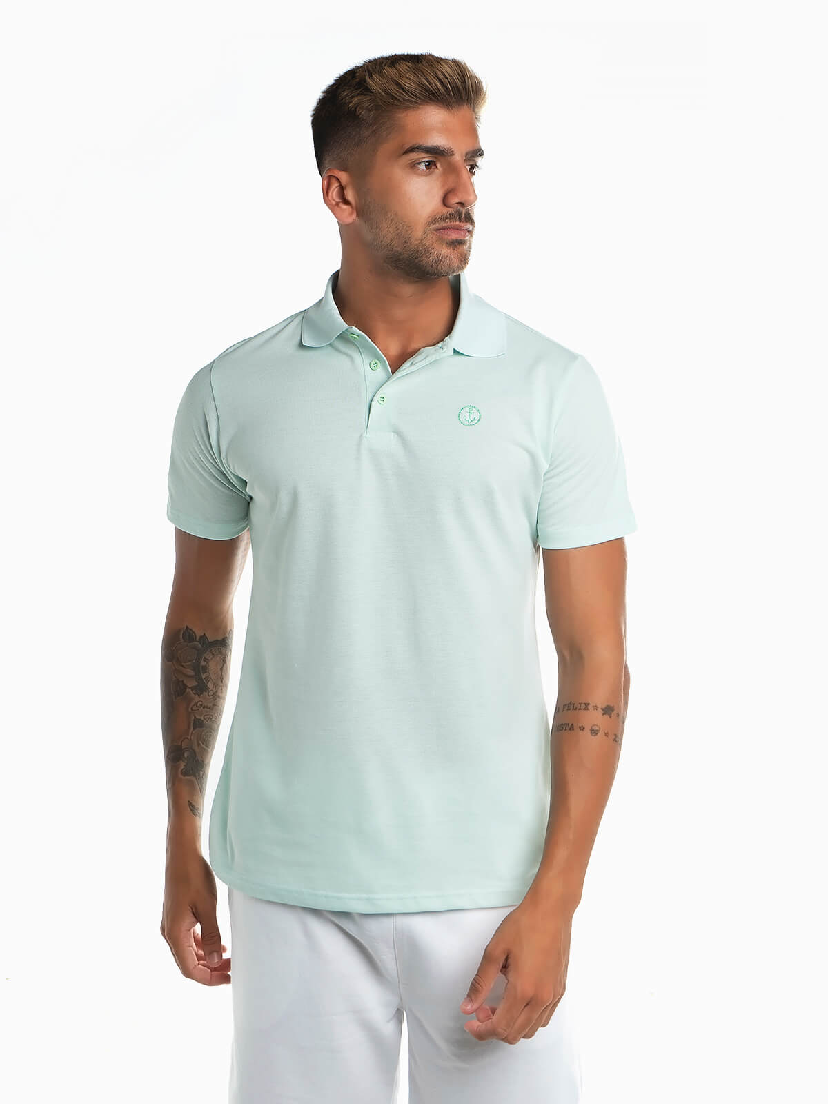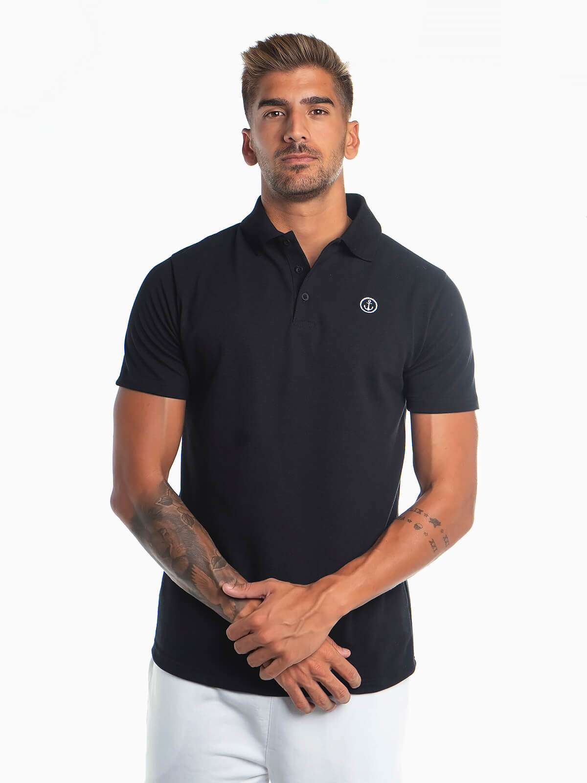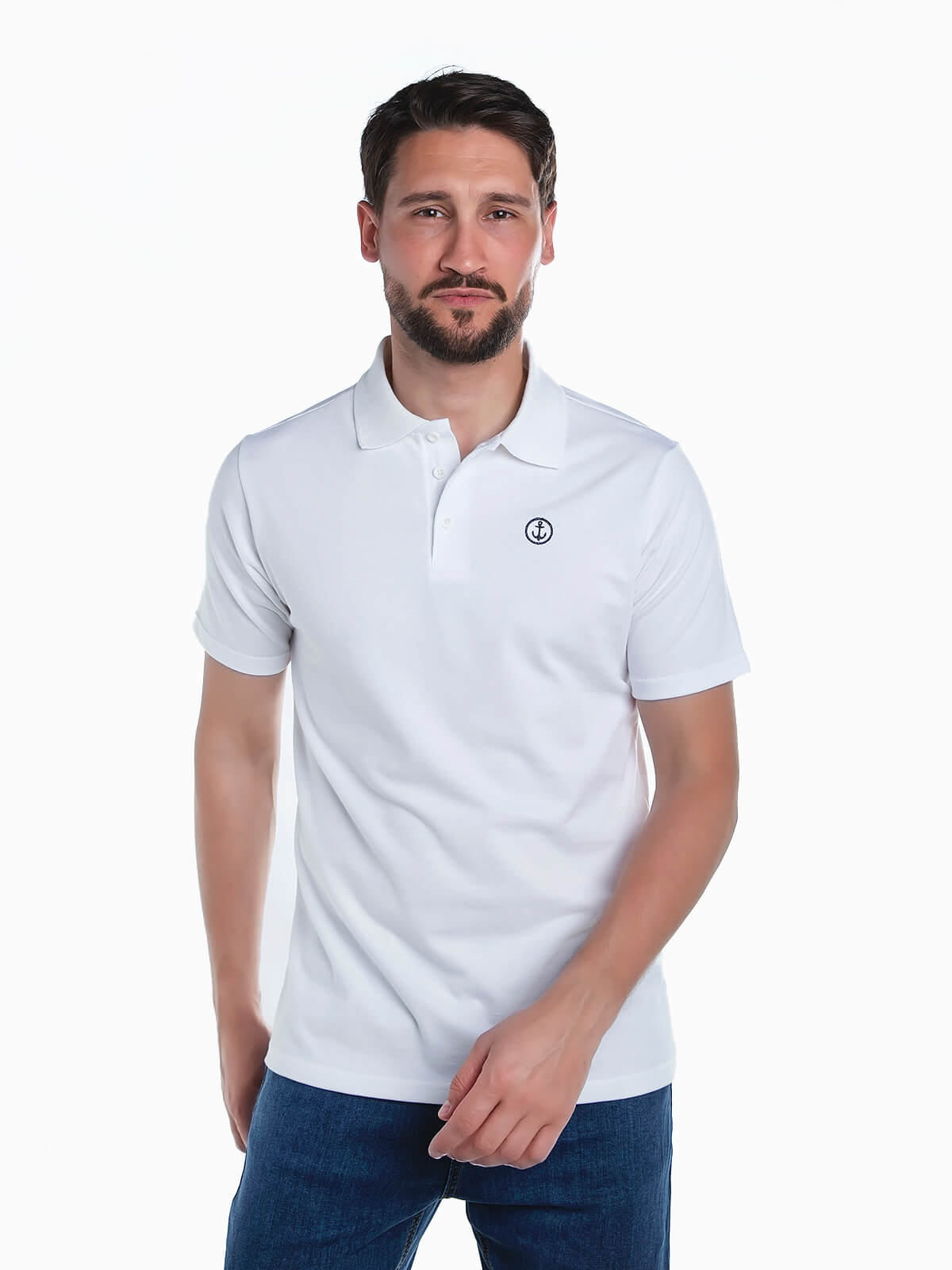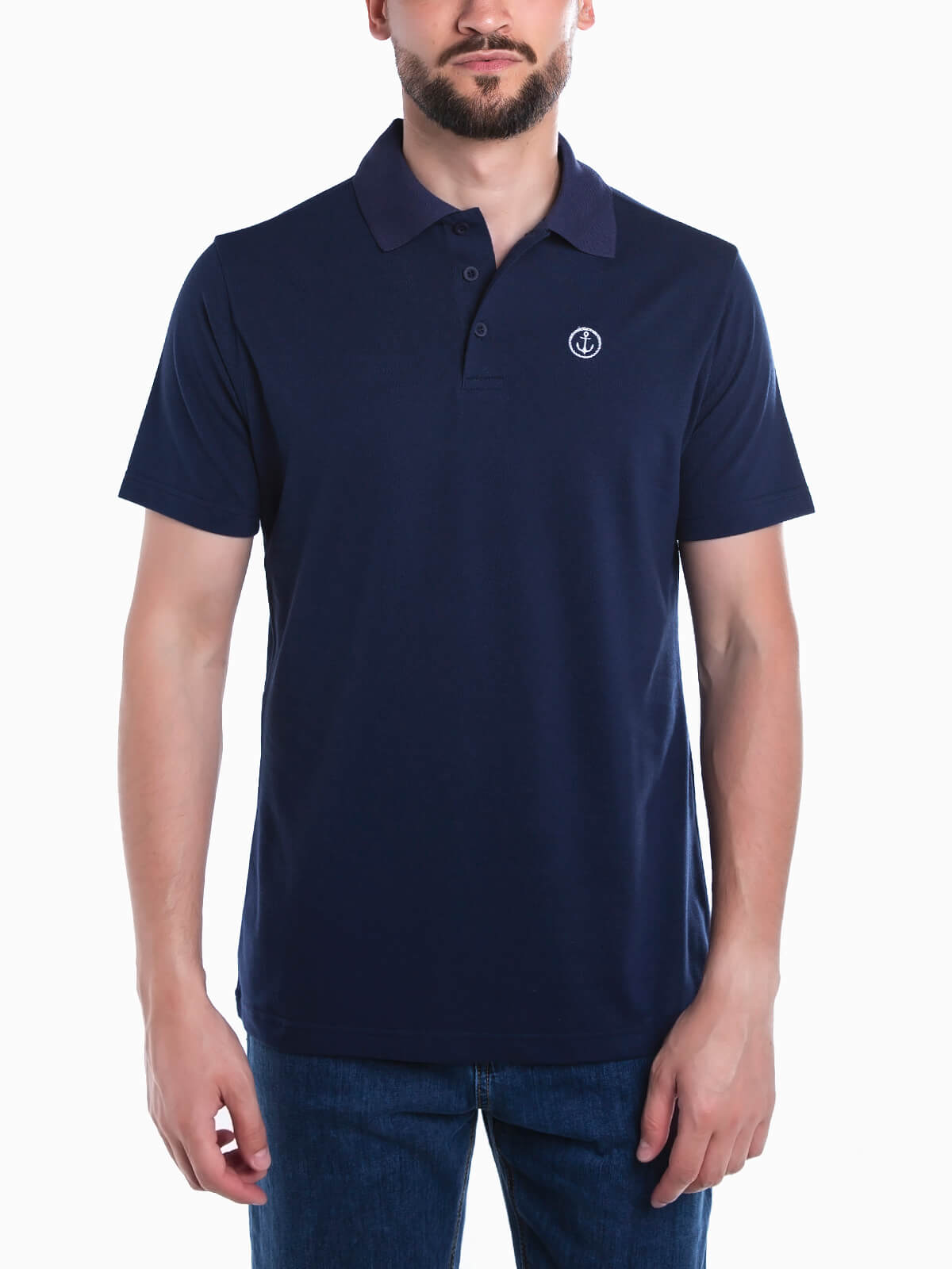 Polo de manga curta com bordado de âncora no peito. Polo em tecido piqué com gola de abas. Carcela com 3 botões.