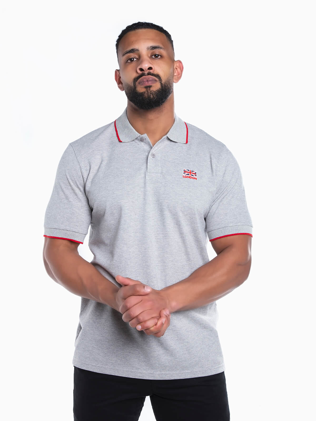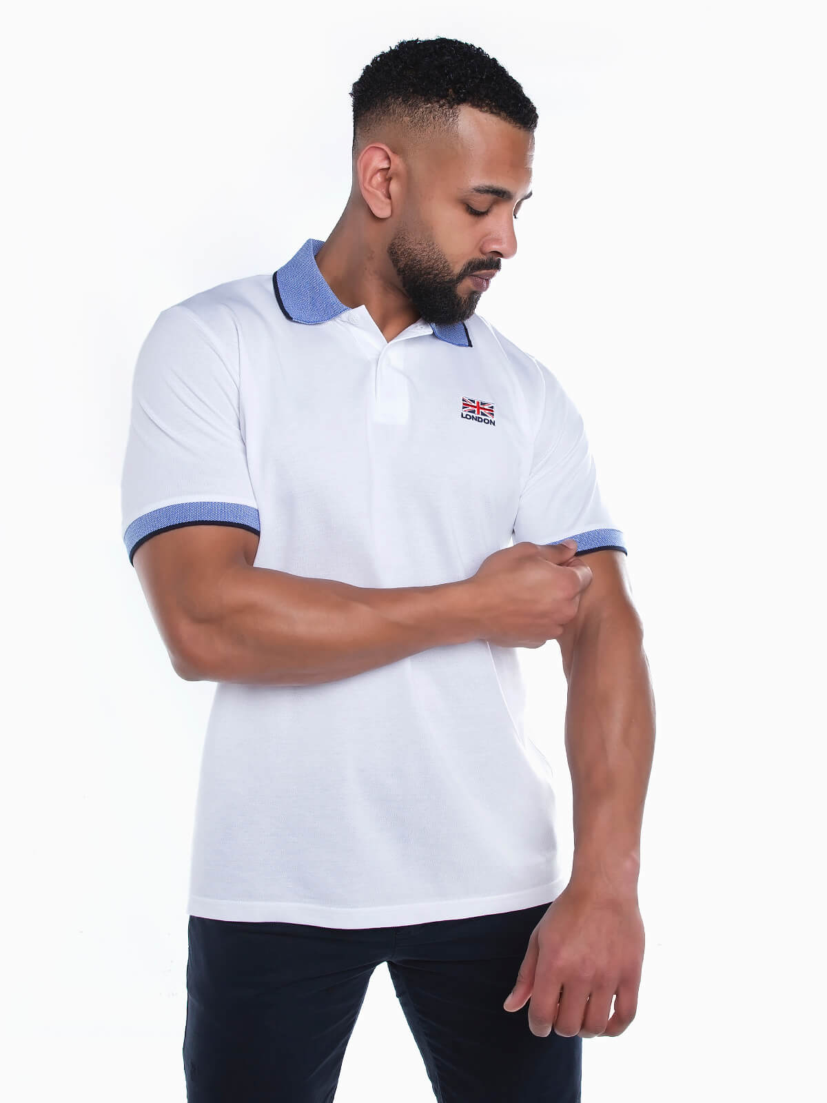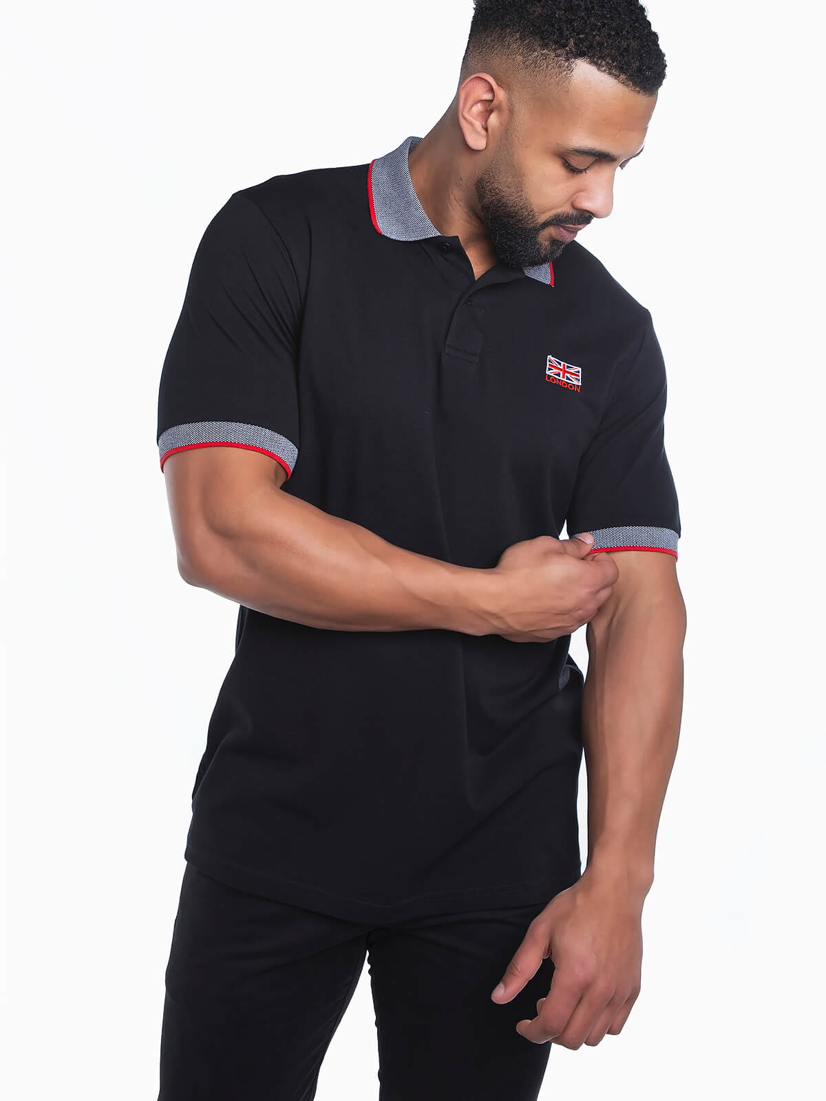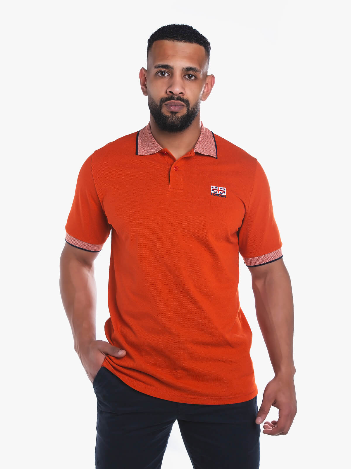 Polo de manga curta com bandeira bordada no peito para homem. Polo piqué com gola de abas e pormenor de cor. Carcela com 2 botões.