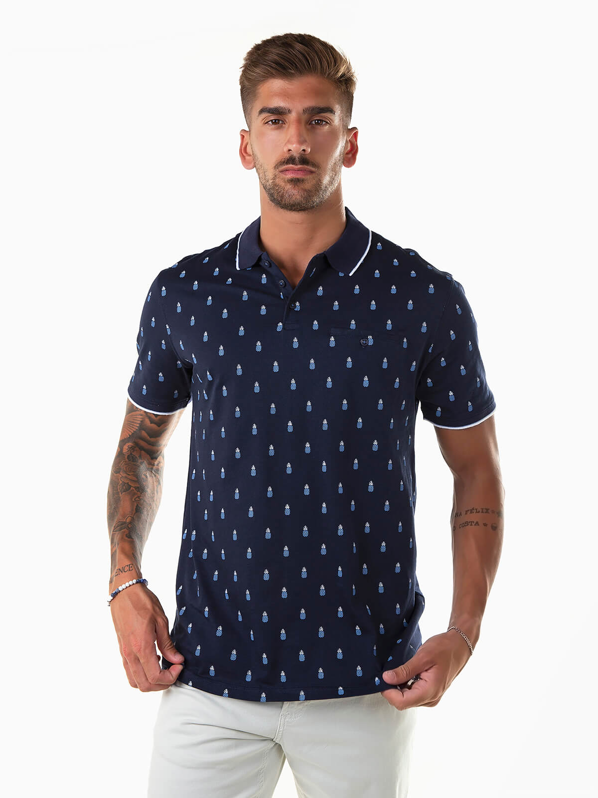 Polo de manga curta com abacaxis estampados e vivos em contraste. Polo para homem com bolso no peito. Colarinho abas. Carcela reforçada com 3 botões.