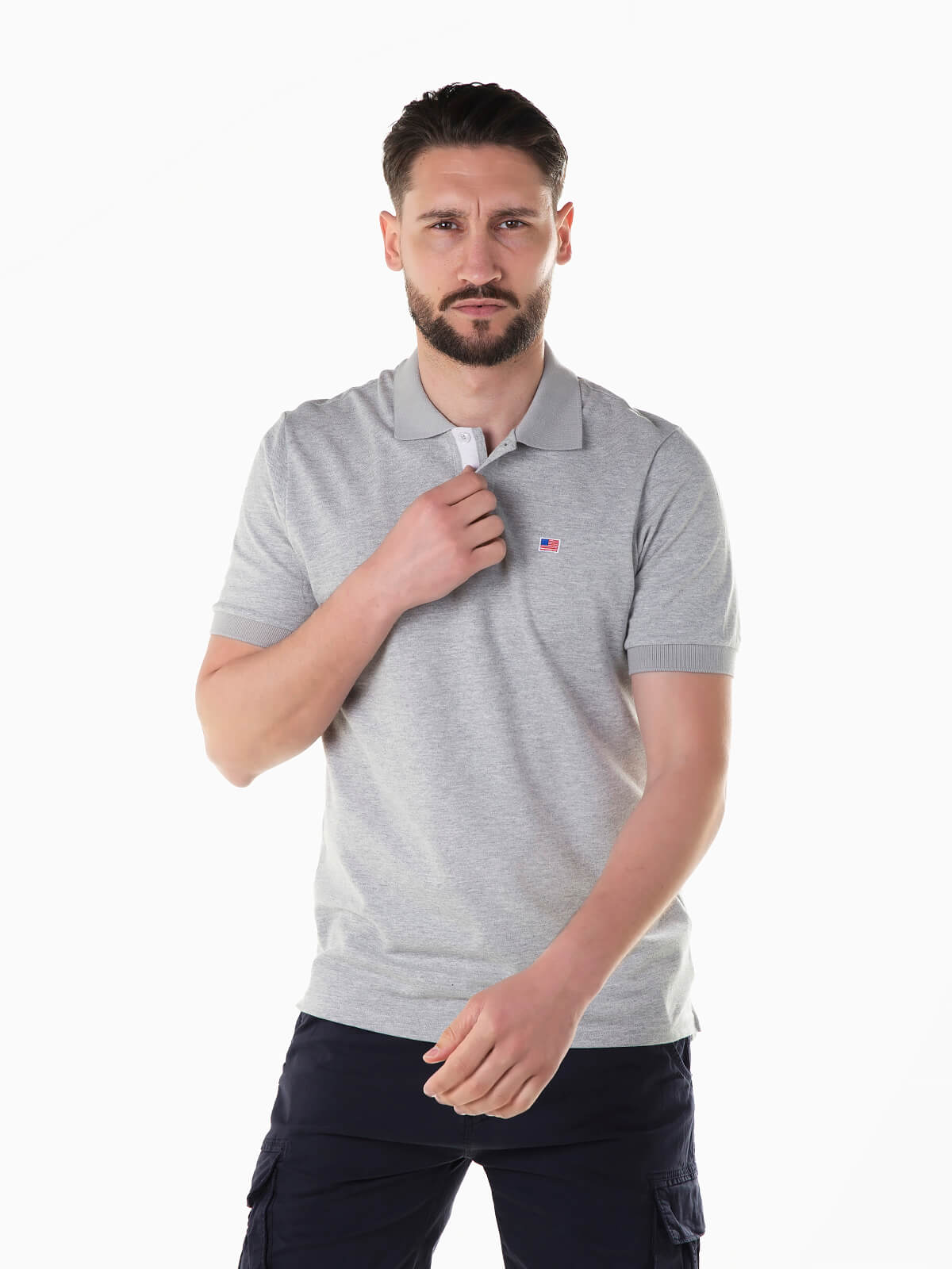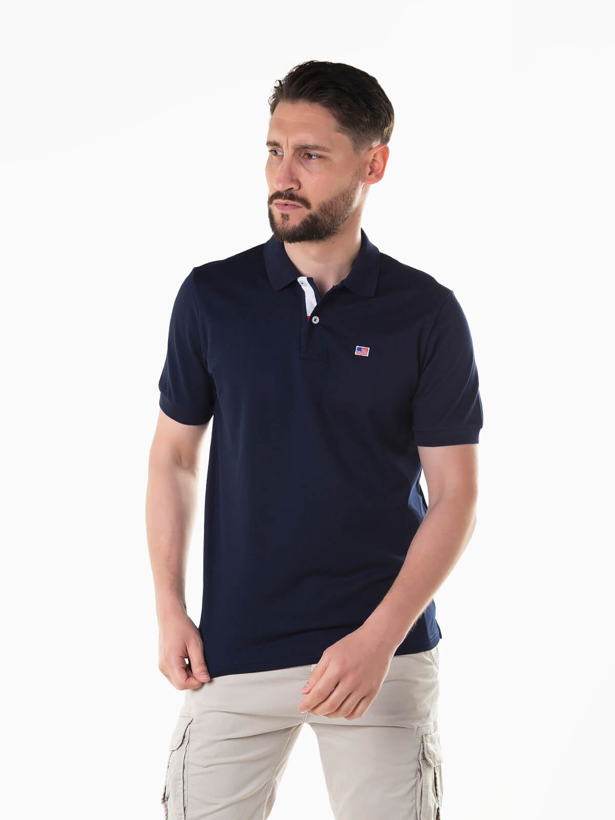 Polo manga curta com bandeira bordada no peito. Polo piqué com gola abas. Carcela reforçada com encaixe de cores e 2 botões.