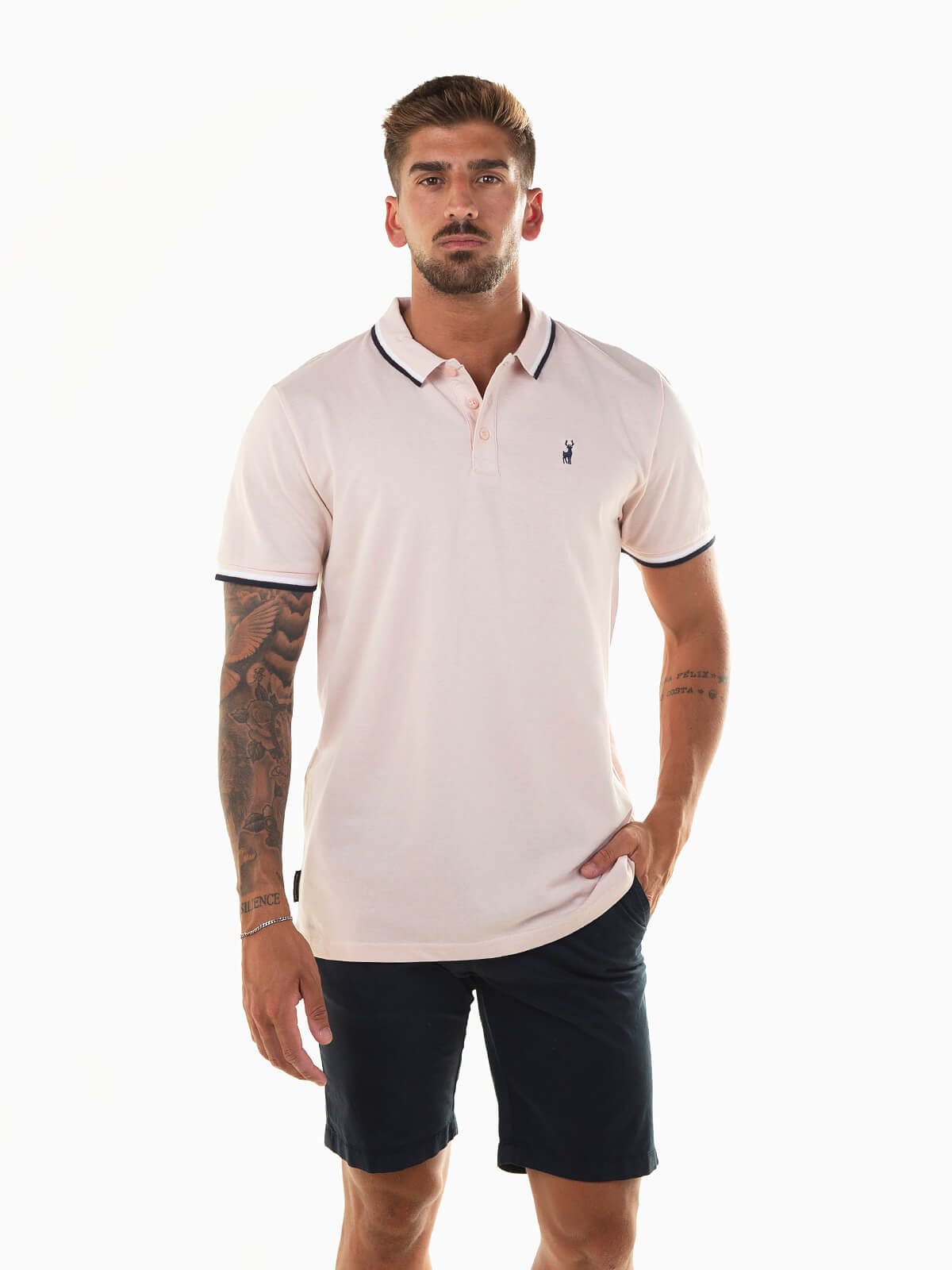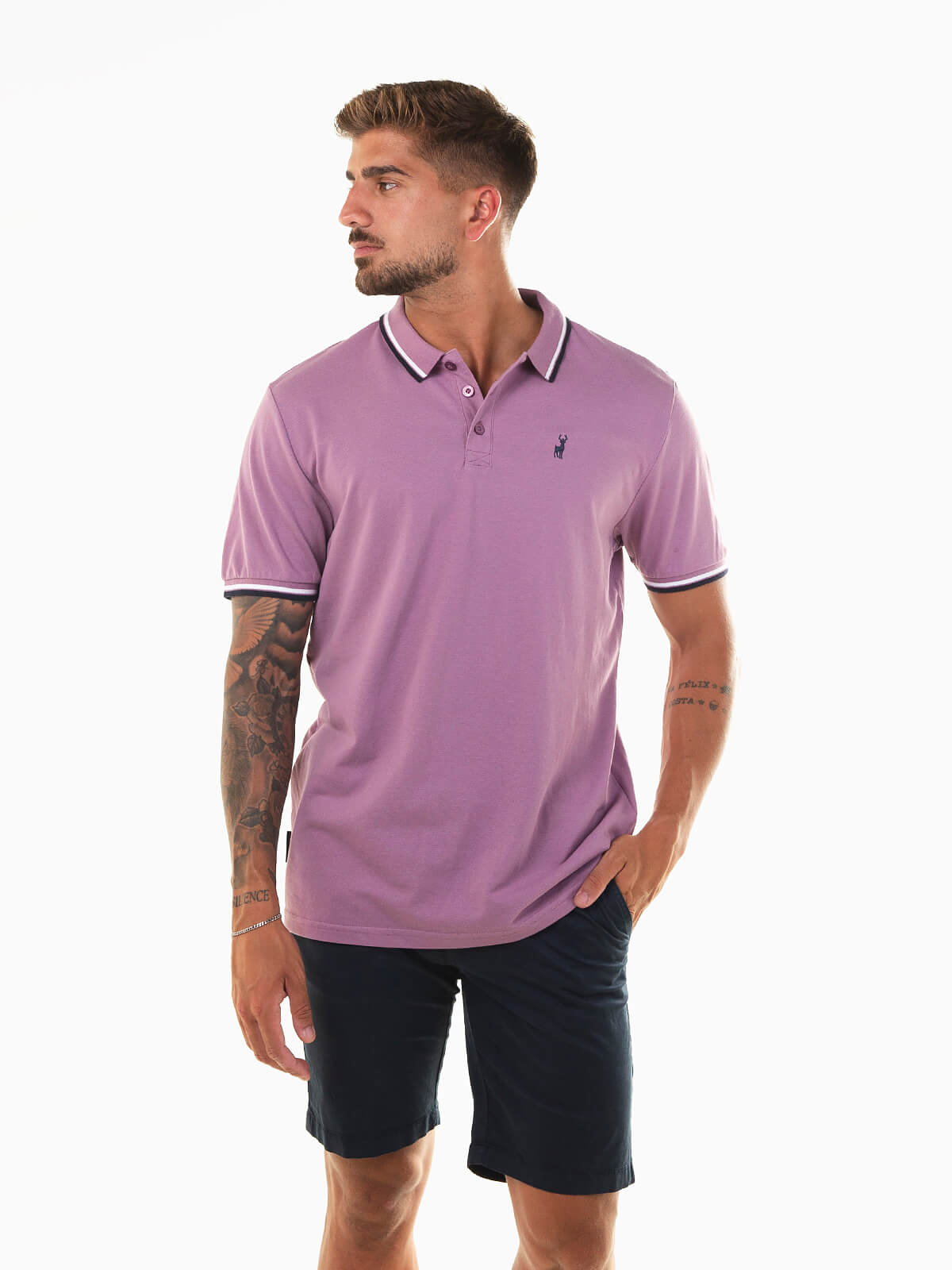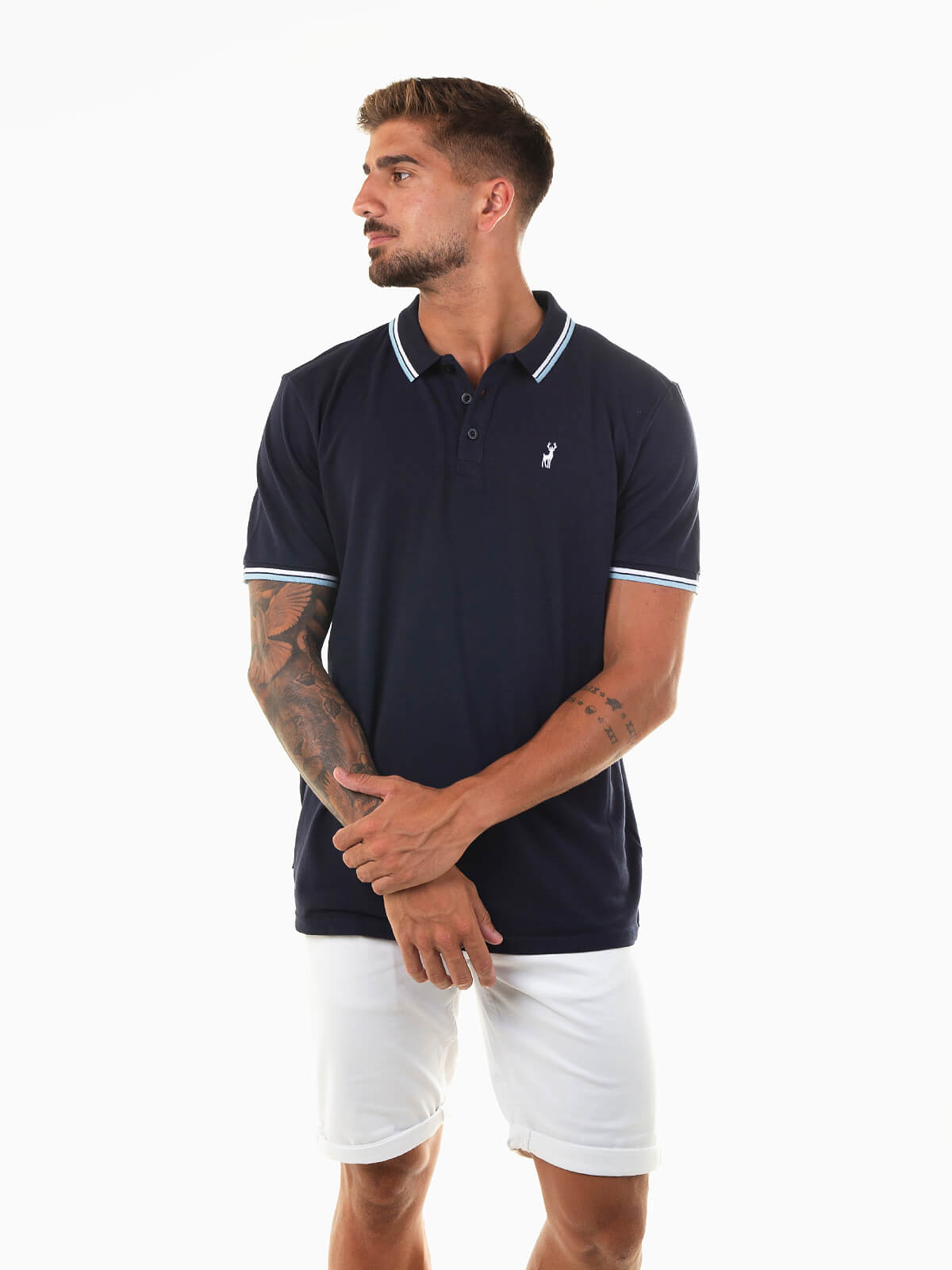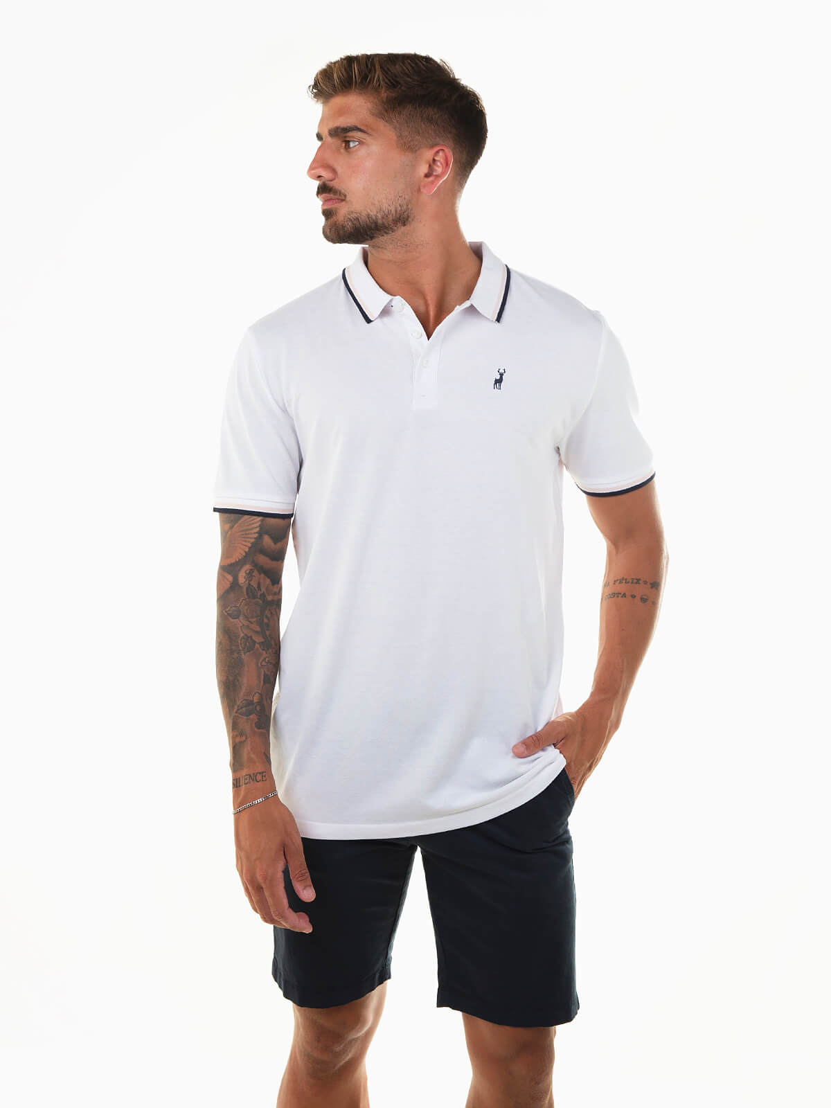 Polo de manga curta em malha piqué 100% algodão, com símbolo de veado bordado no peito. Gola e extremidades das mangas com riscas finas em contraste. Modelo com carcela de três botões e corte confortável.