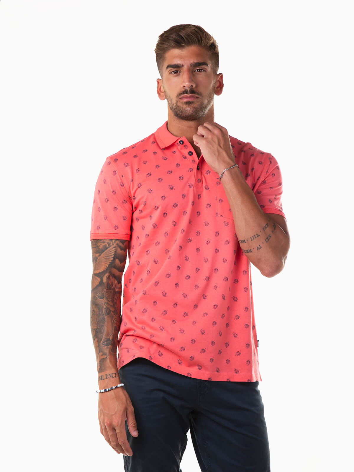 Polo de manga curta com folhas estampadas em contraste. Polo para homem com bolso no peito. Colarinho abas. Carcela reforçada com 3 botões.