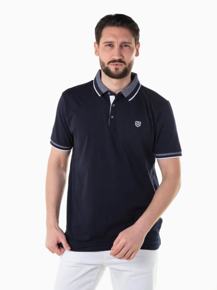 Polo de manga curta com encaixe cor e símbolo bordado. Polo piqué para homem com gola abas. Carcela reforçada com 3 botões.