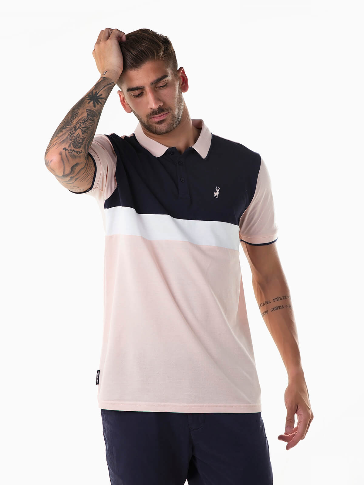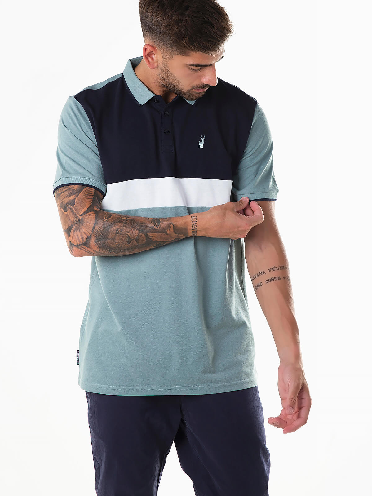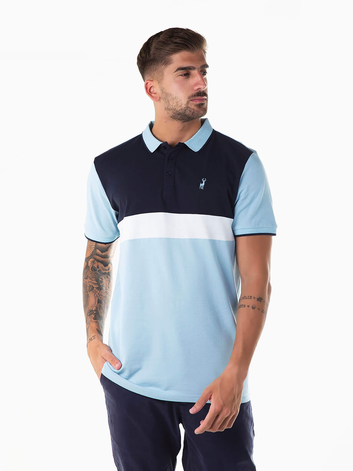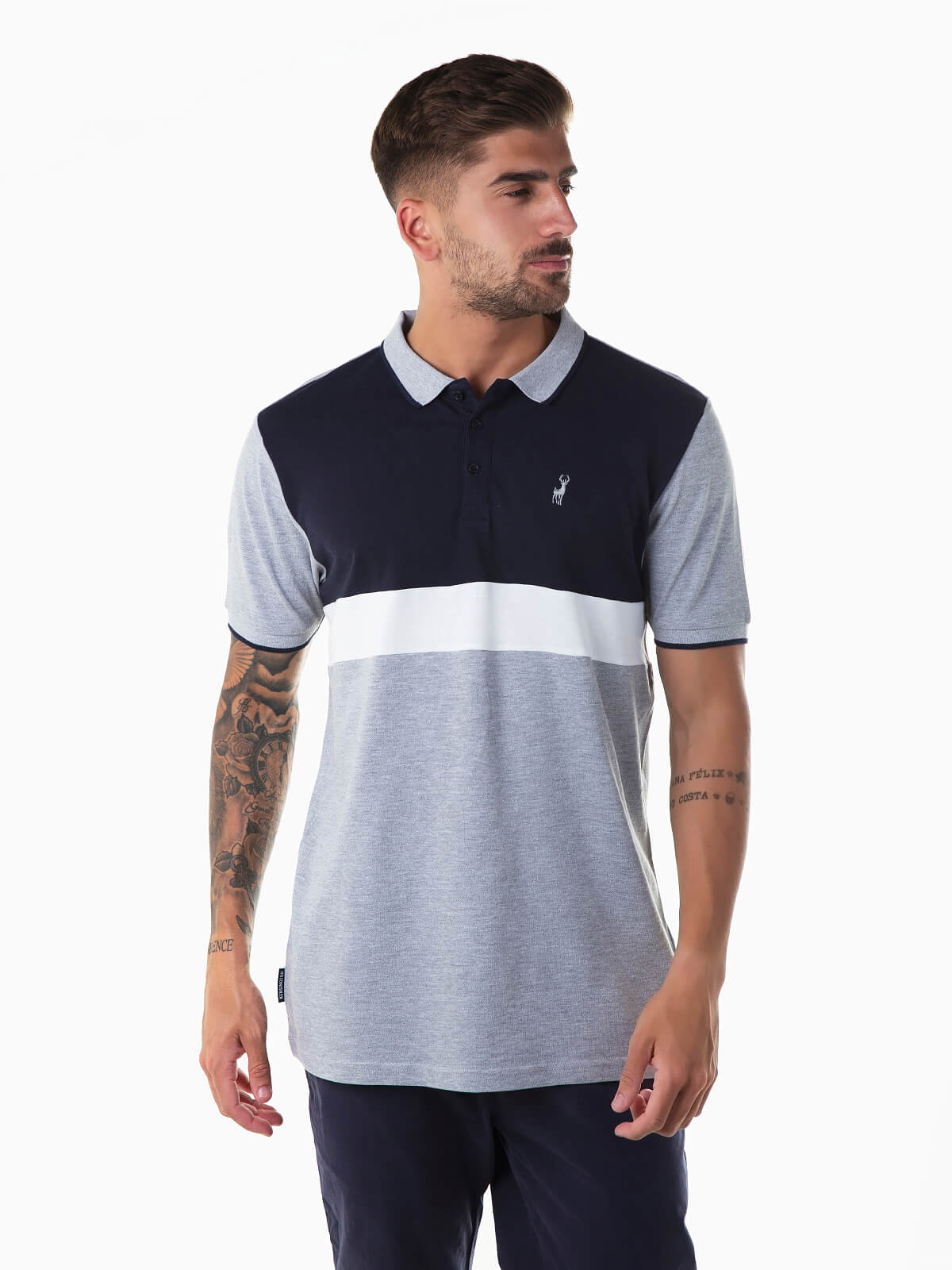Polo de manga curta com encaixe de cores à frente. Polo piqué para homem com símbolo bordado no peito. Gola abas. Carcela reforçada com 3 botões.