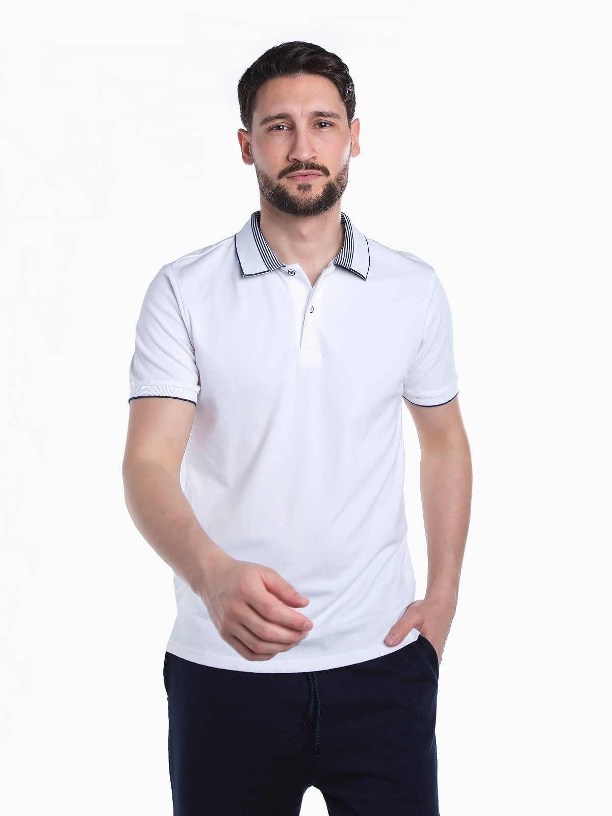 Polo de manga curta com gola de abas às riscas para homem. Polo em tecido piqué. Carcela com 3 botões.