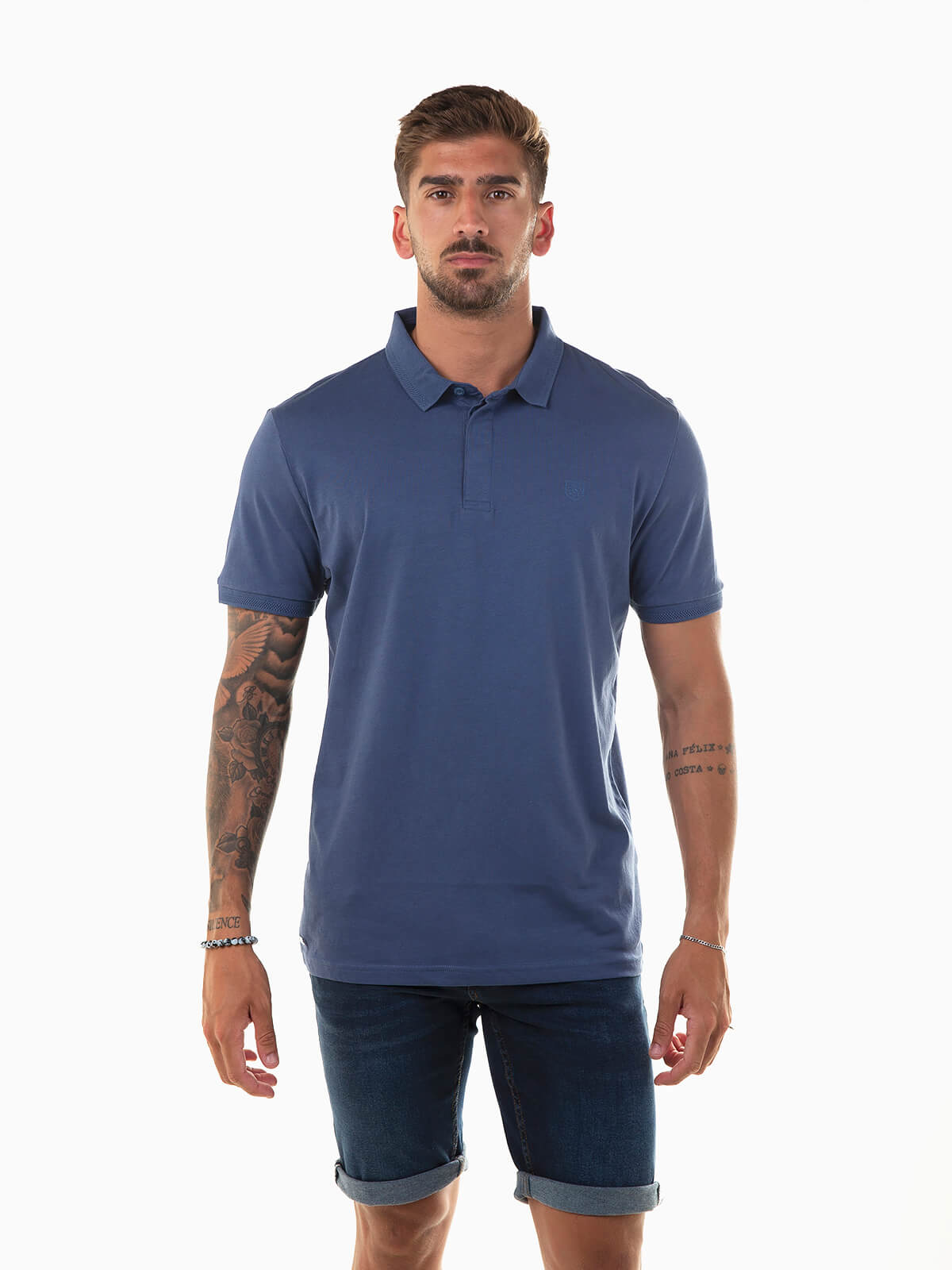 Polo de manga curta com gola de abas estruturada para homem. Polo 100% algodão com símbolo no peito. Carcela reforçada com 3 botões.