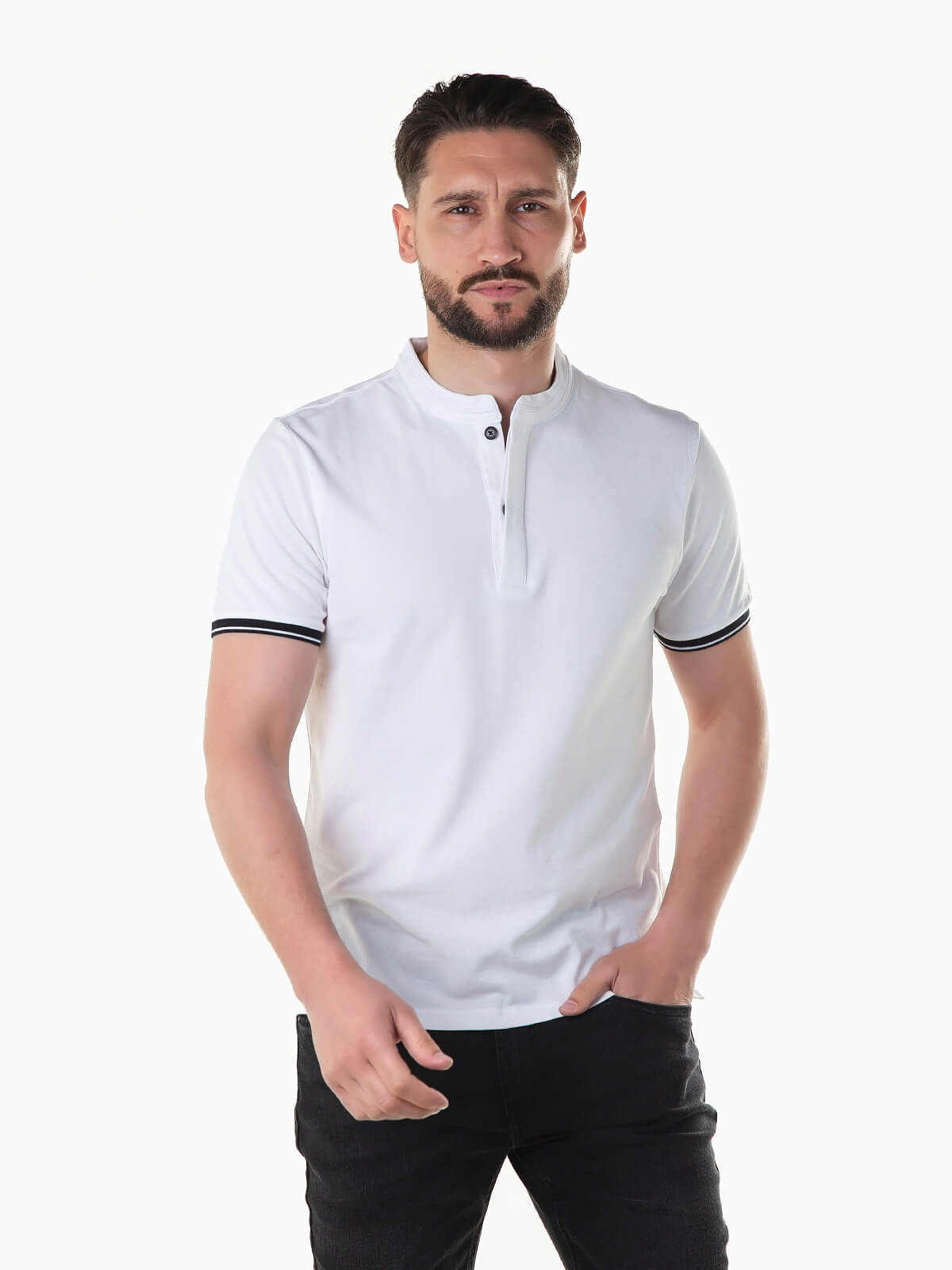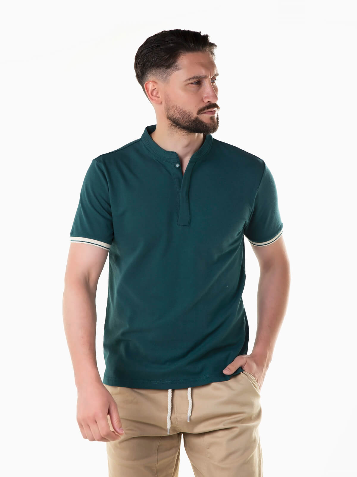 Polo piqué de manga curta com gola mao. Polo para homem slim fit. Carcela reforçada com 2 botões. Pormenor de cor na manga.
