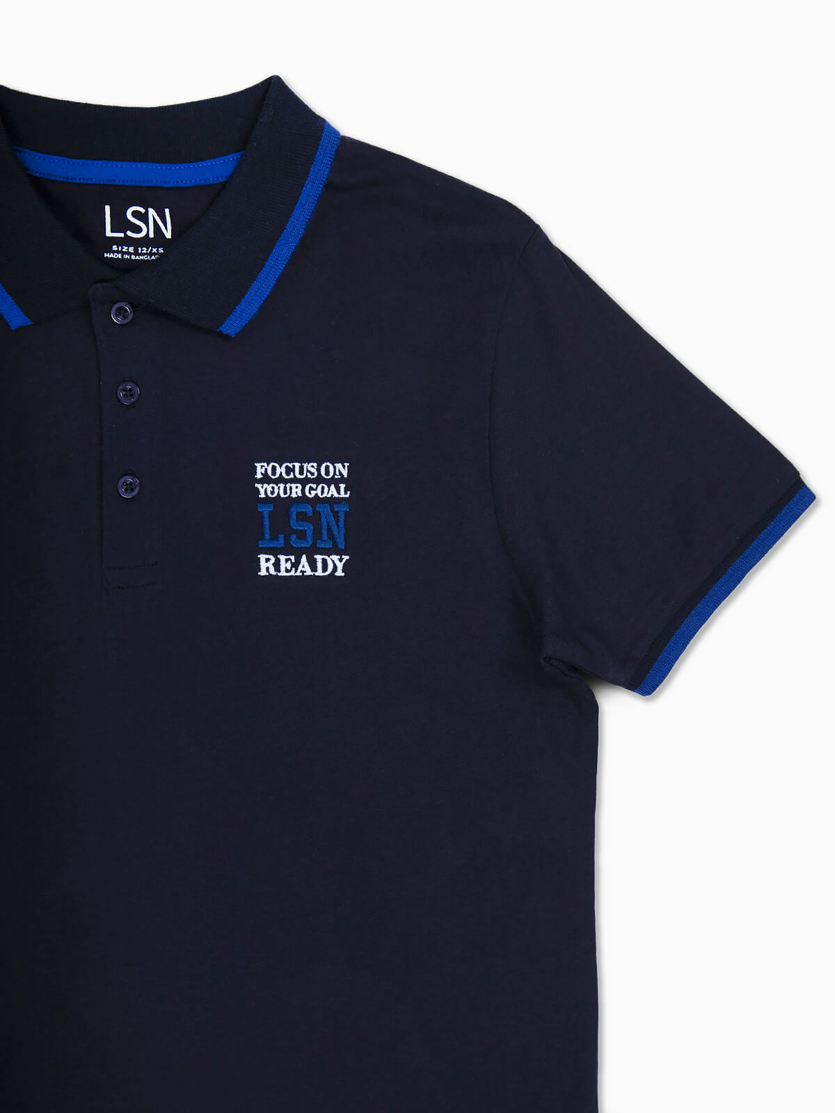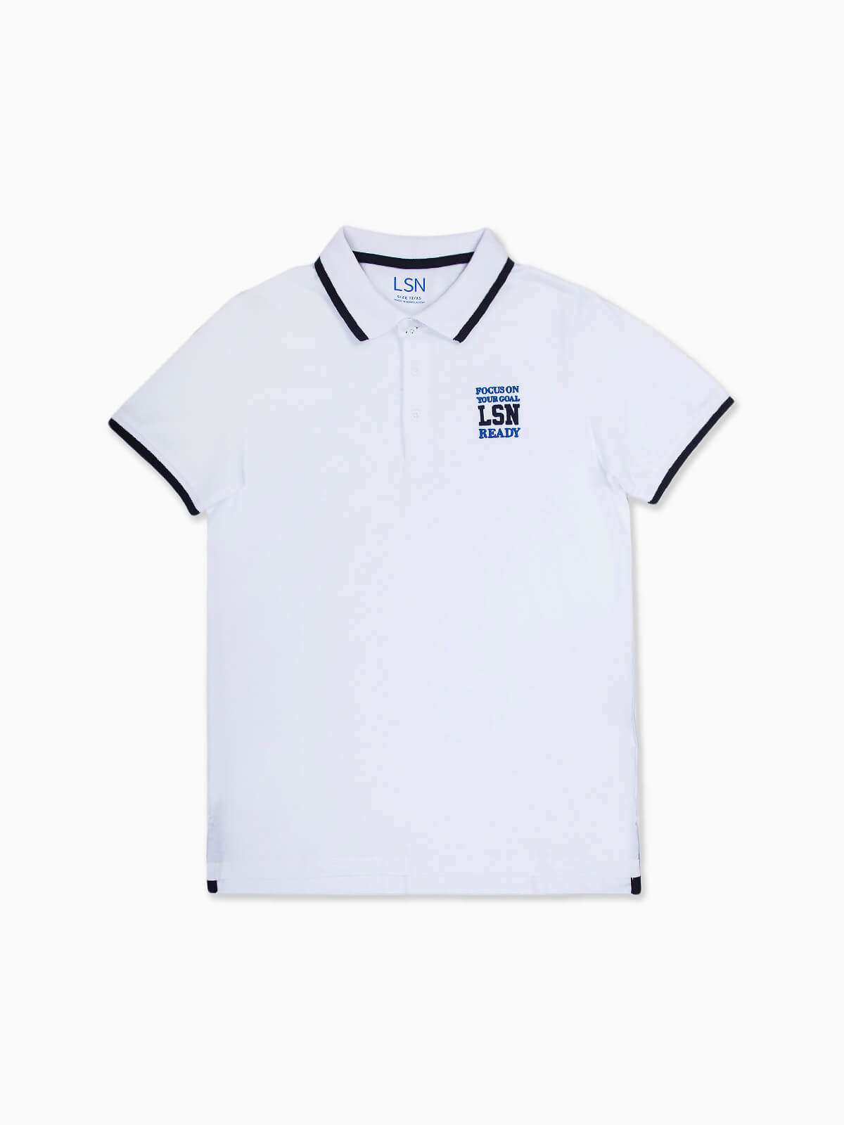 Polo de manga curta com letras bordadas no peito. Polo em 100% algodão com gola clássica e carcela com 3 botões. Pormenor de tira de cor em contraste.