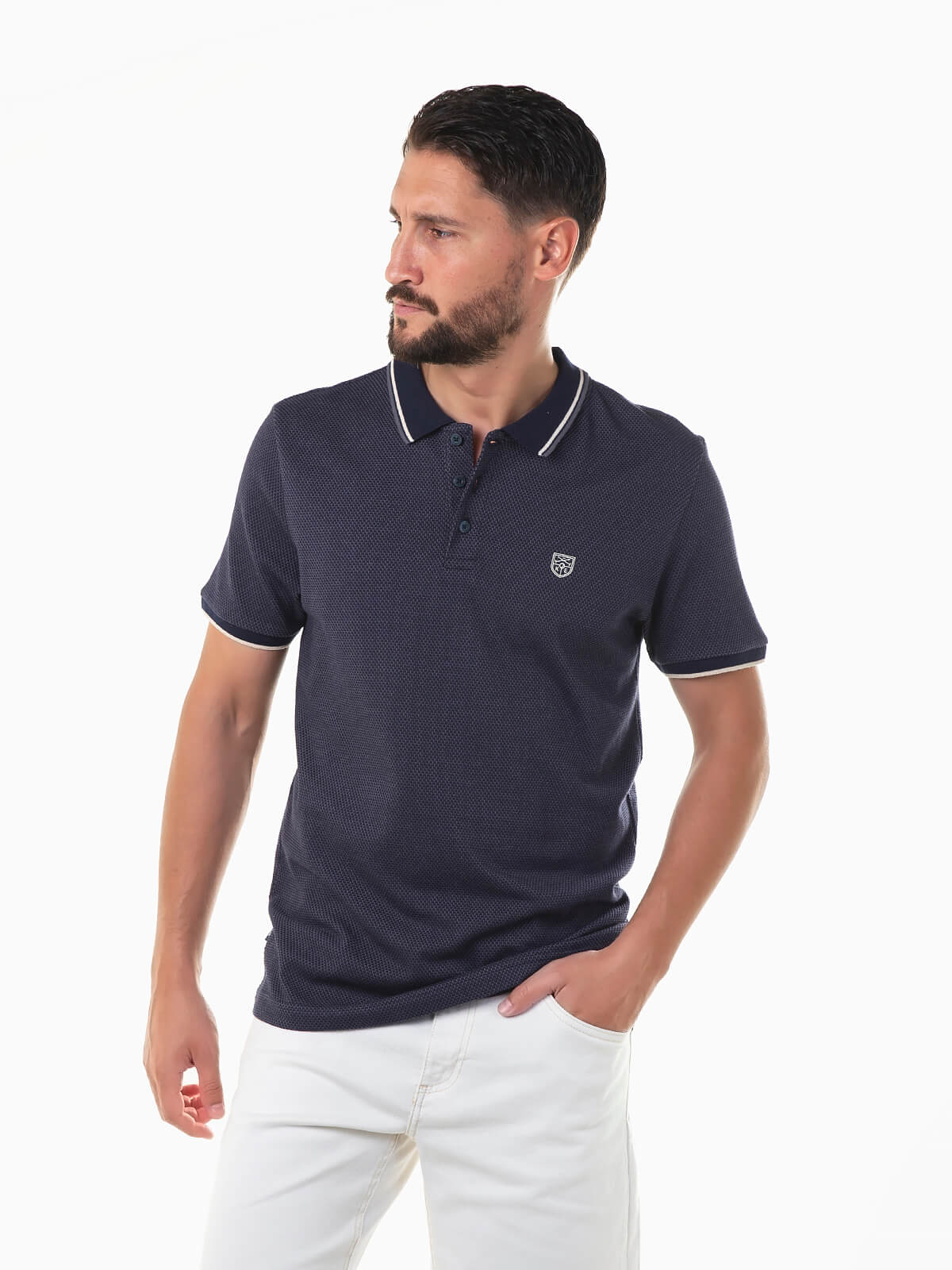 Polo de manga curta em malha trabalhada e símbolo no peito. Polo para homem com gola abas e carcela reforçada com 3 botões.