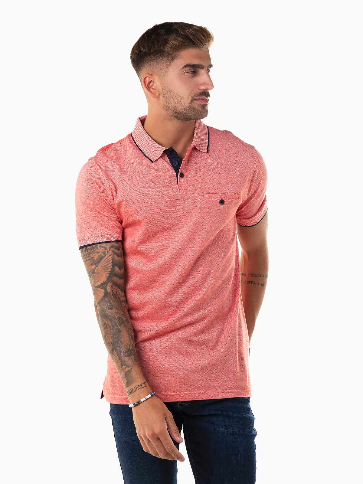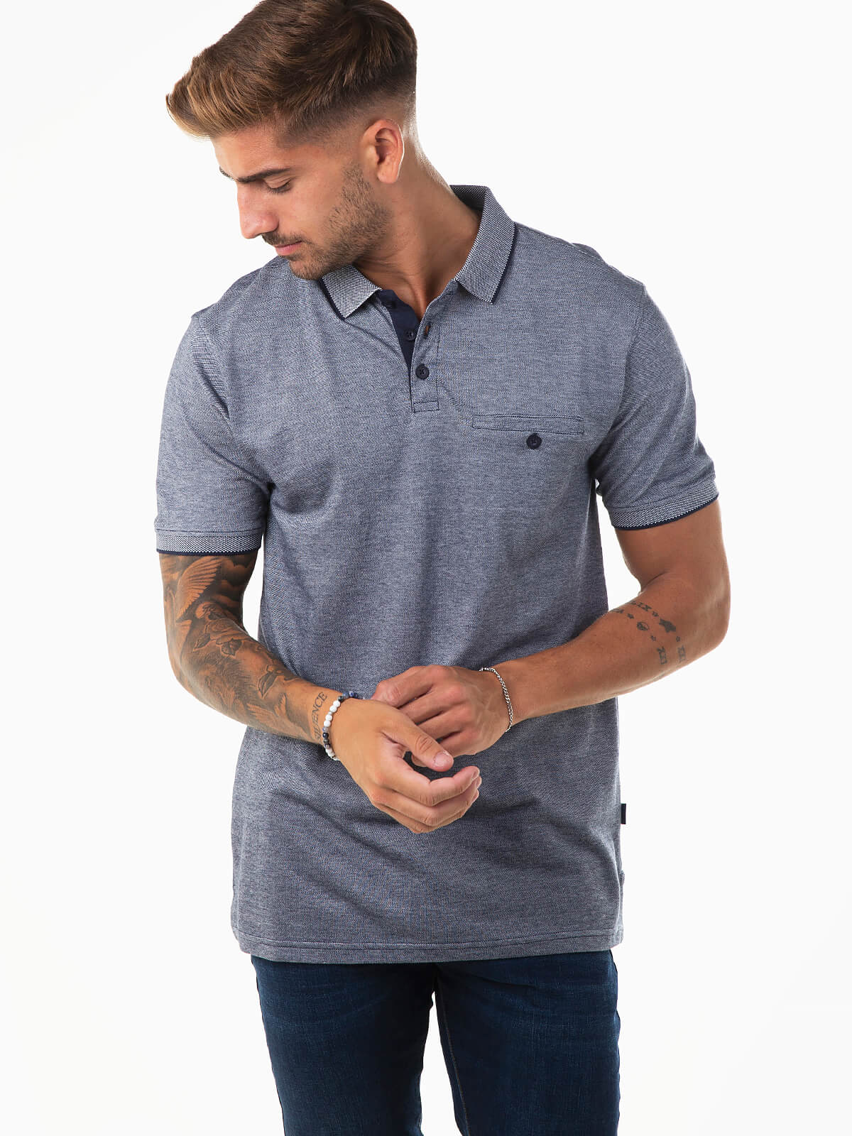 Polo de manga curta em malha mesclada com bolso no peito. Polo piqué para homem. Colarinho abas e carcela reforçada com 3 botões.