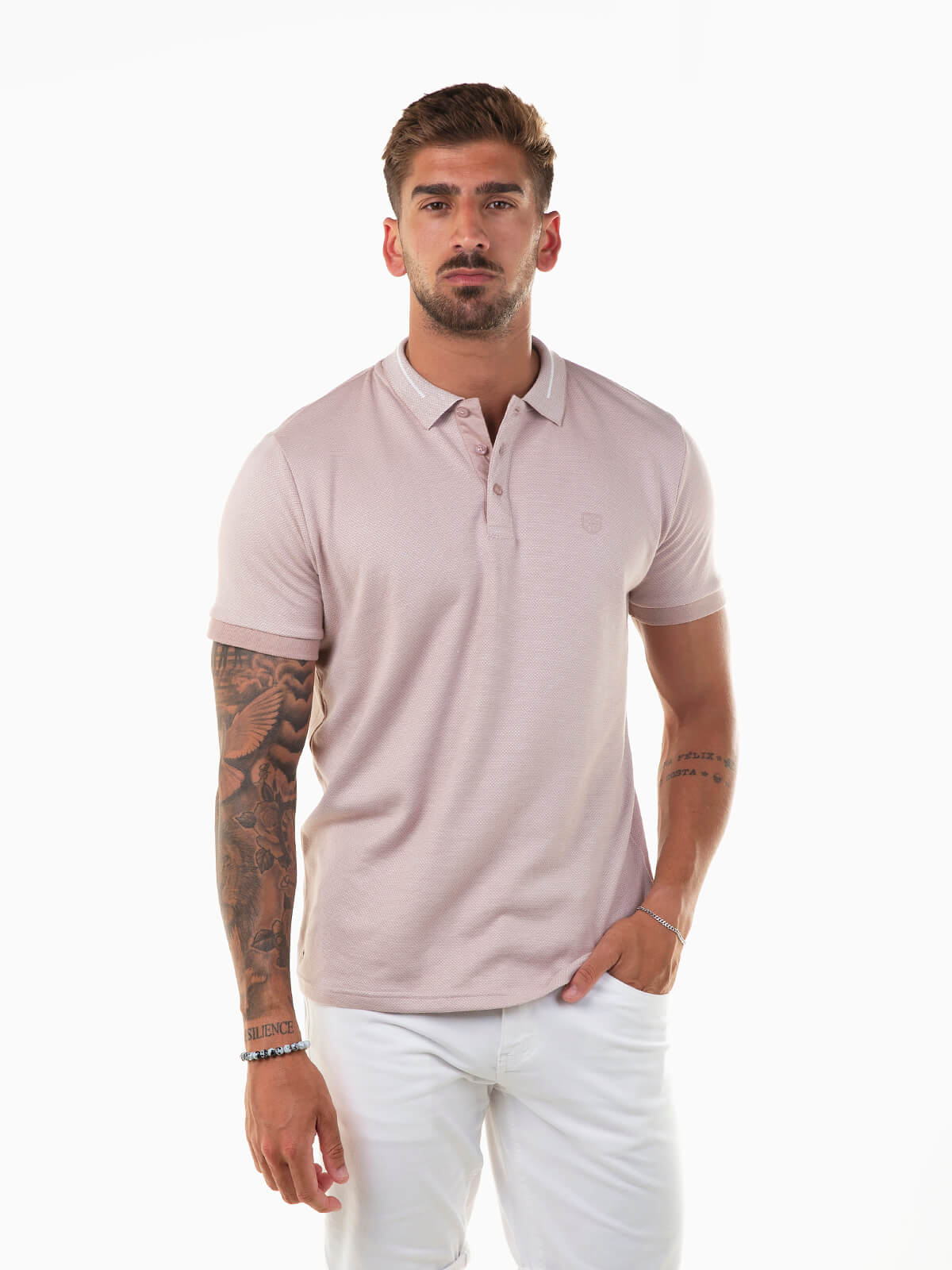 Polo de manga curta em malha piqué mesclada que oferece conforto e durabilidade. Modelo com gola e carcela reforçada com 3 botões a combinar. Acabamento discreto no peito com logótipo, ideal para um look casual com um toque sofisticado.
