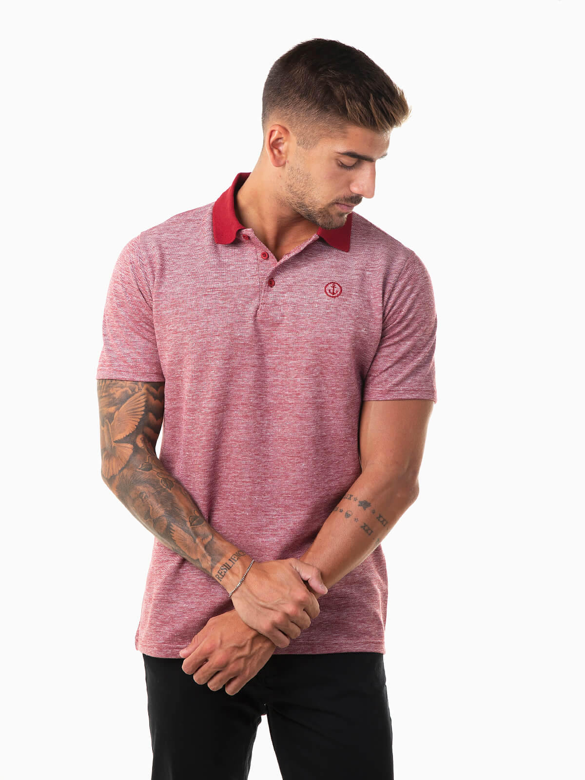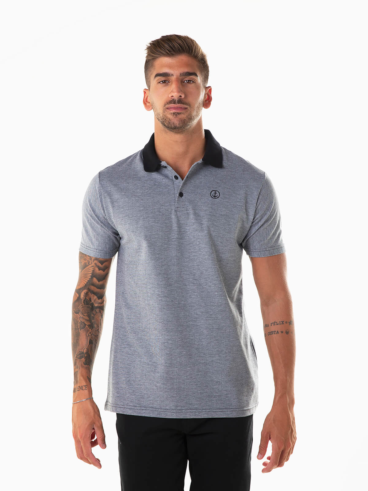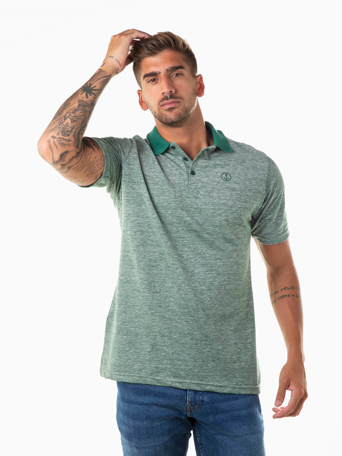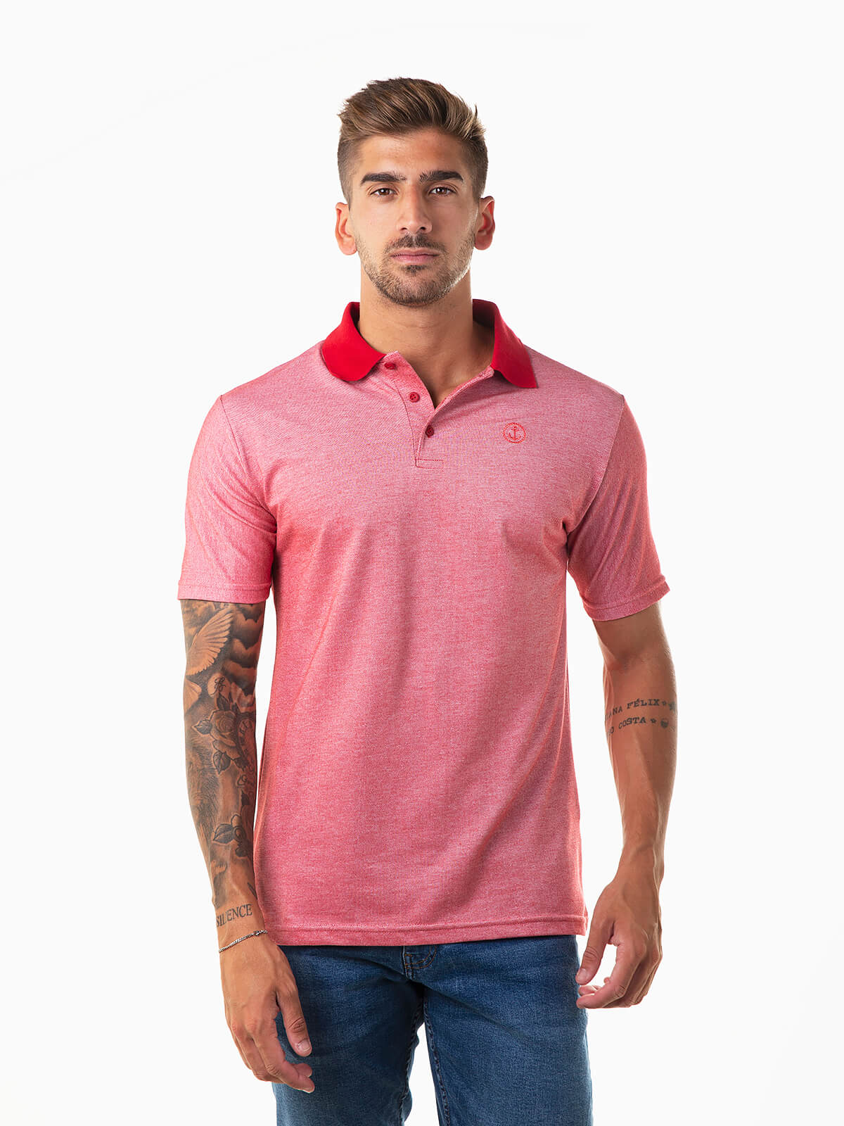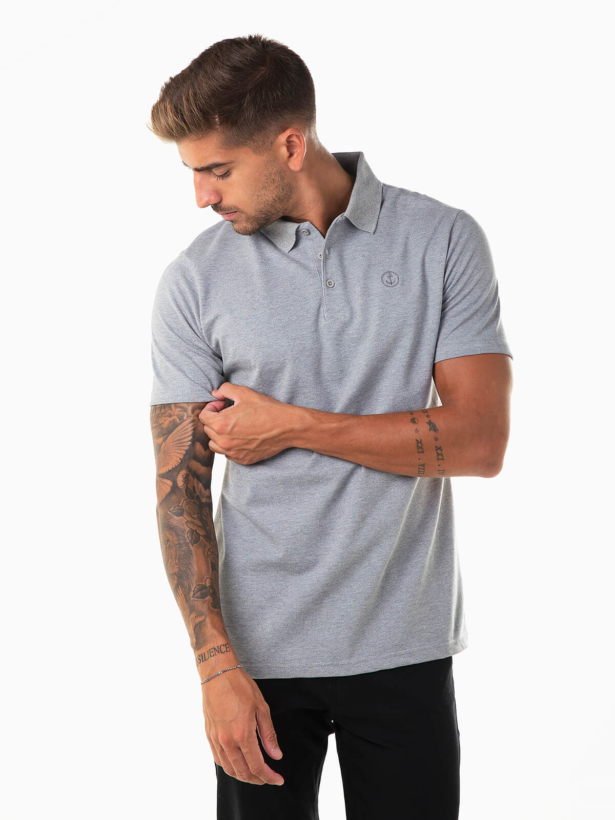 Polo de manga curta em malha mesclada com símbolo bordado no peito. Polo piqué com colarinho abas e carcela reforçada com 3 botões.