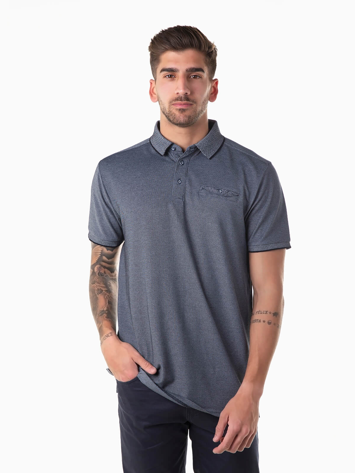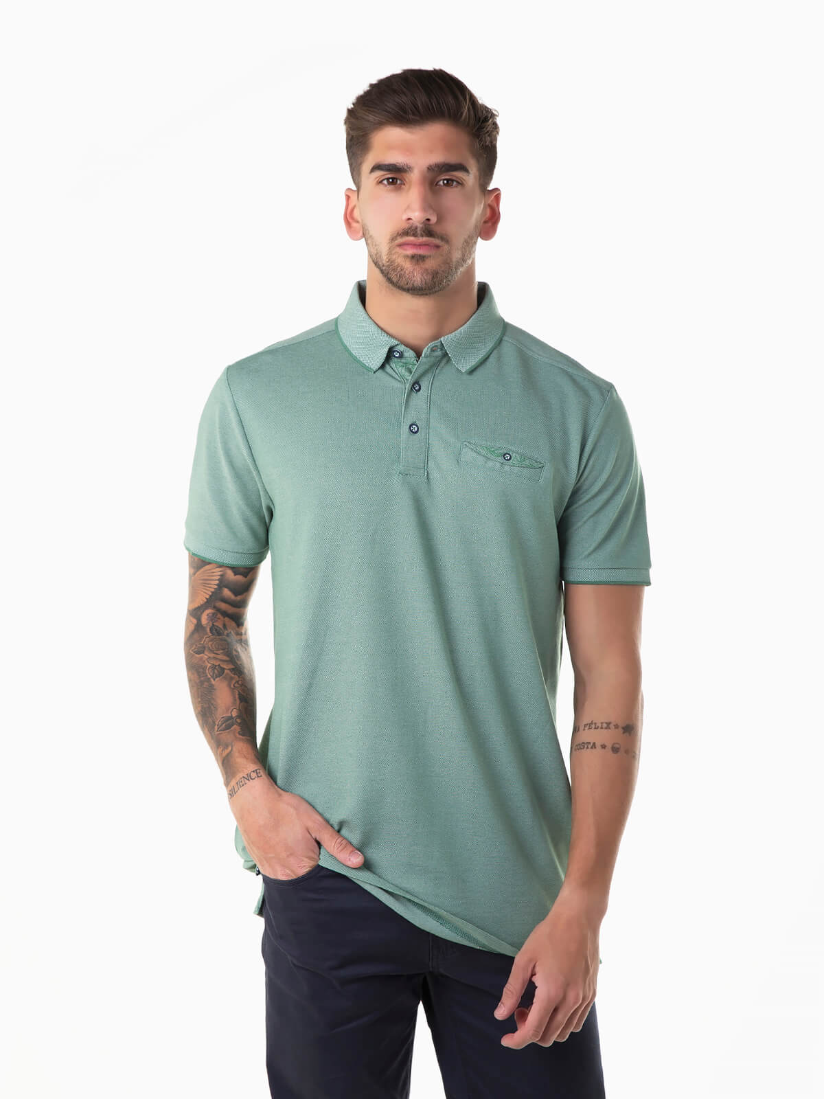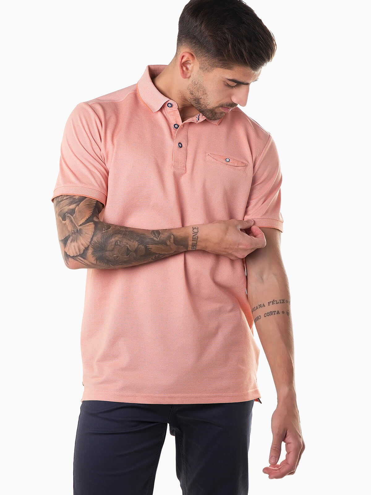 Polo piqué de manga curta com bolso falso no peito. Polo liso com gola abas. Carcela reforçada com três botões.