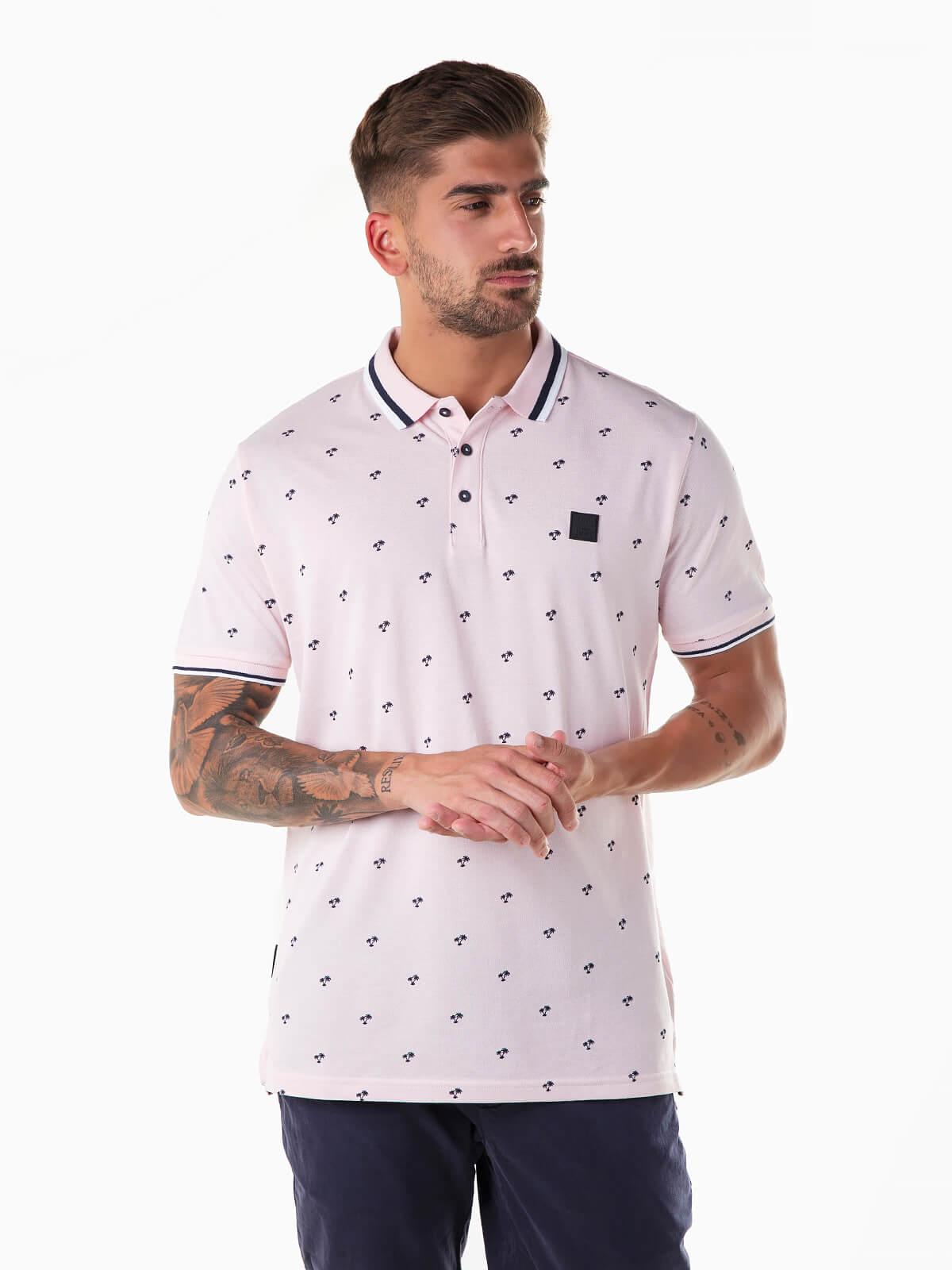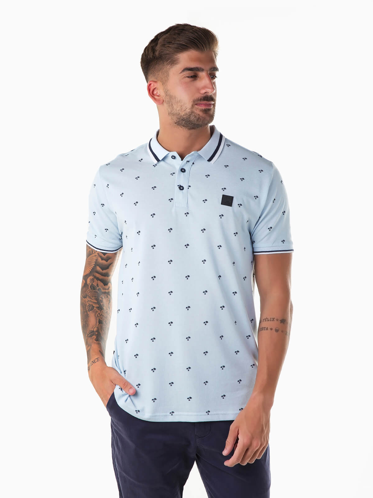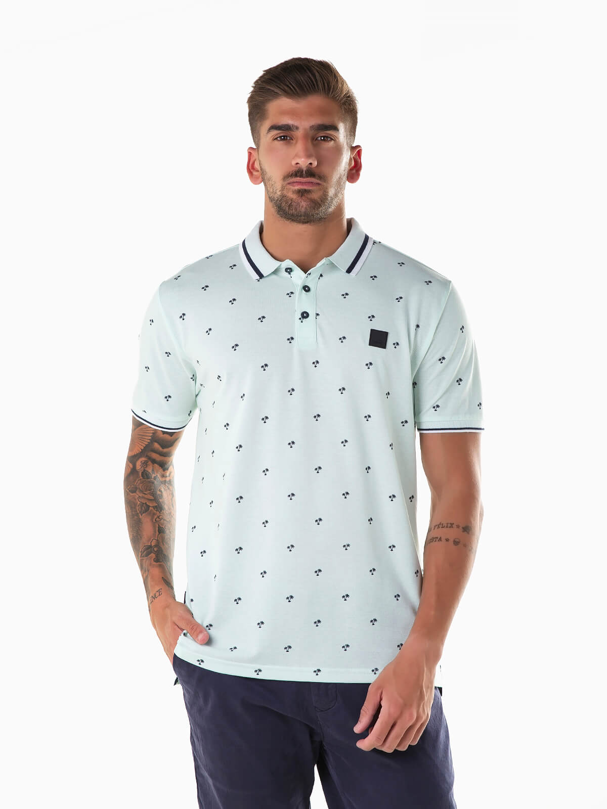 Polo manga curta com estampado de palmeiras e símbolo em borracha. Polo piqué para homem com gola de abas. Carcela reforçada com 3 botões.