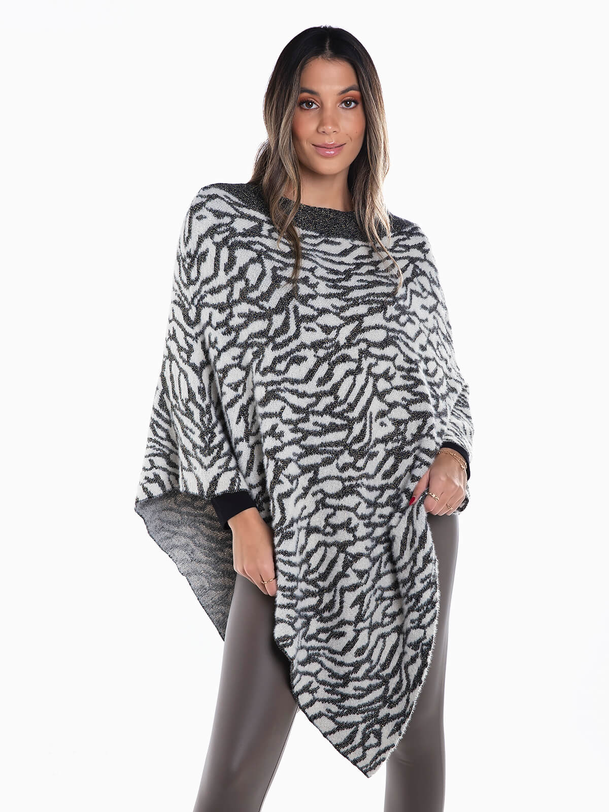 Poncho malha com animal print abstrato. Corte comprido e em V. Fios lurex para efeito brilhante. Decote redondo.