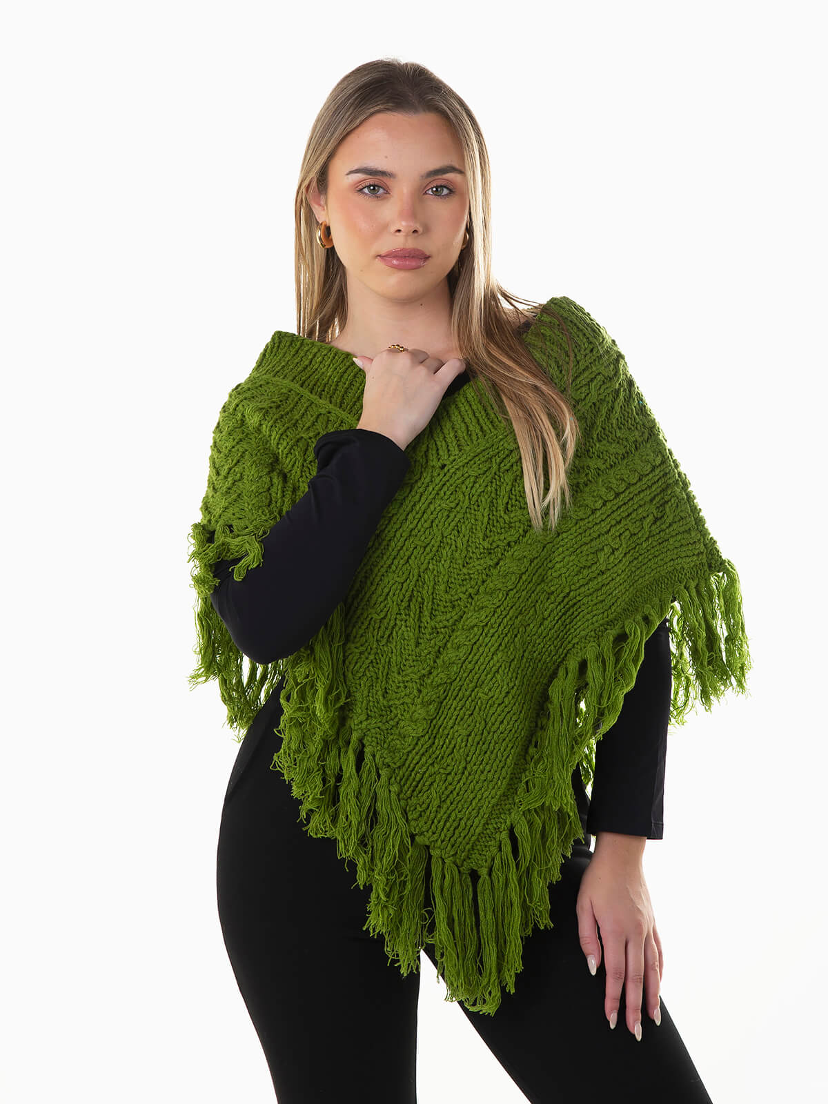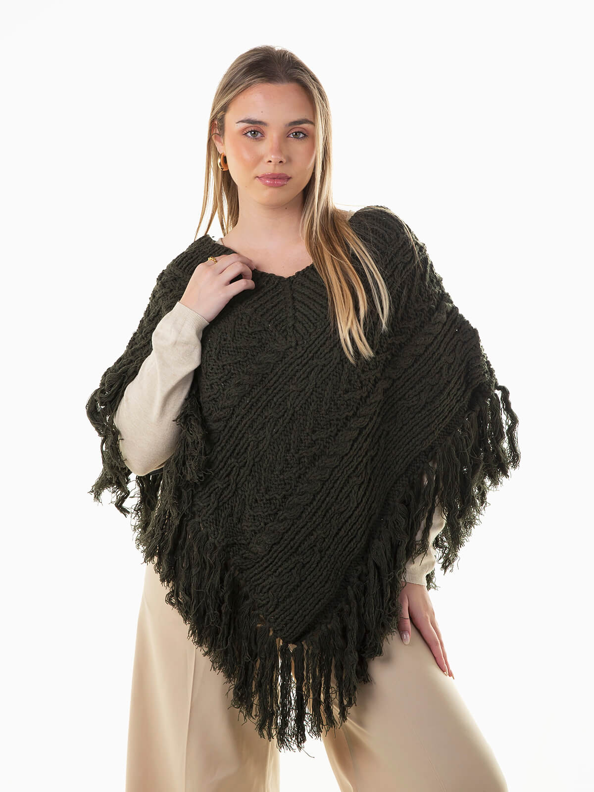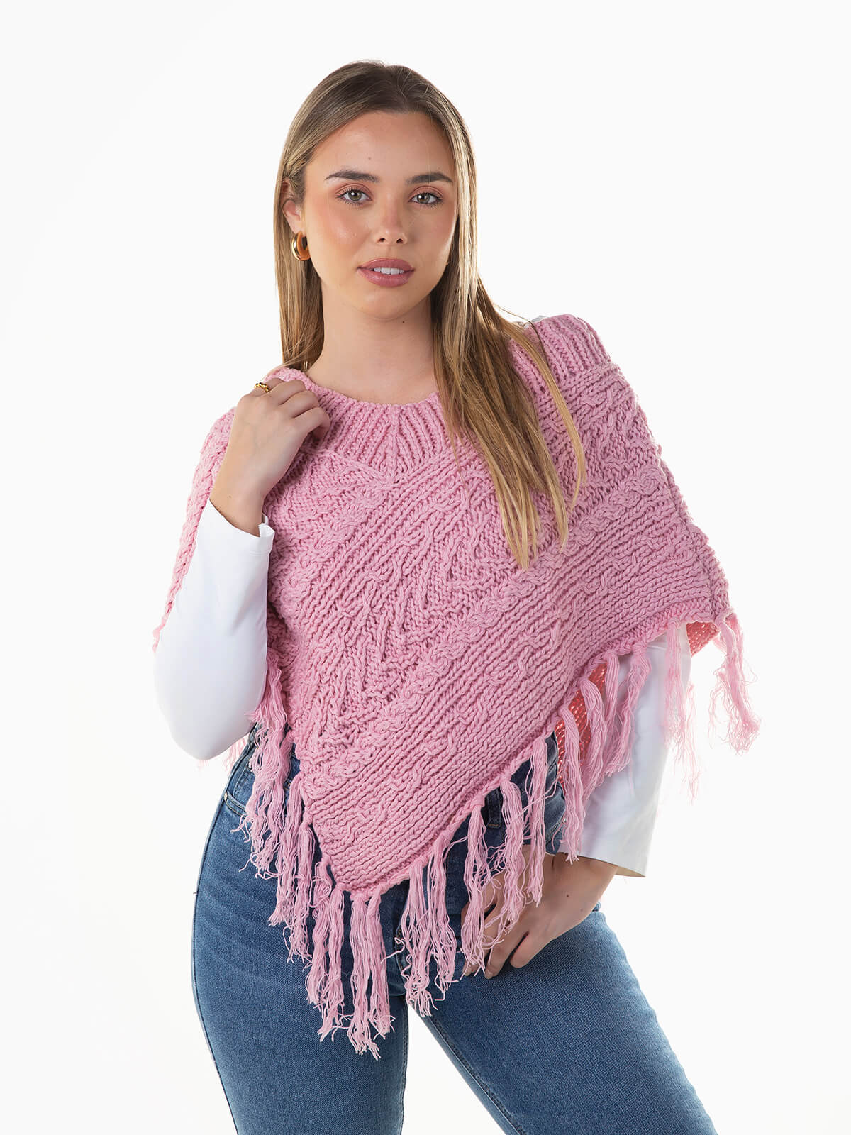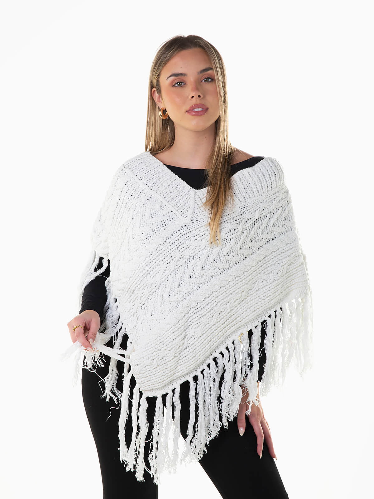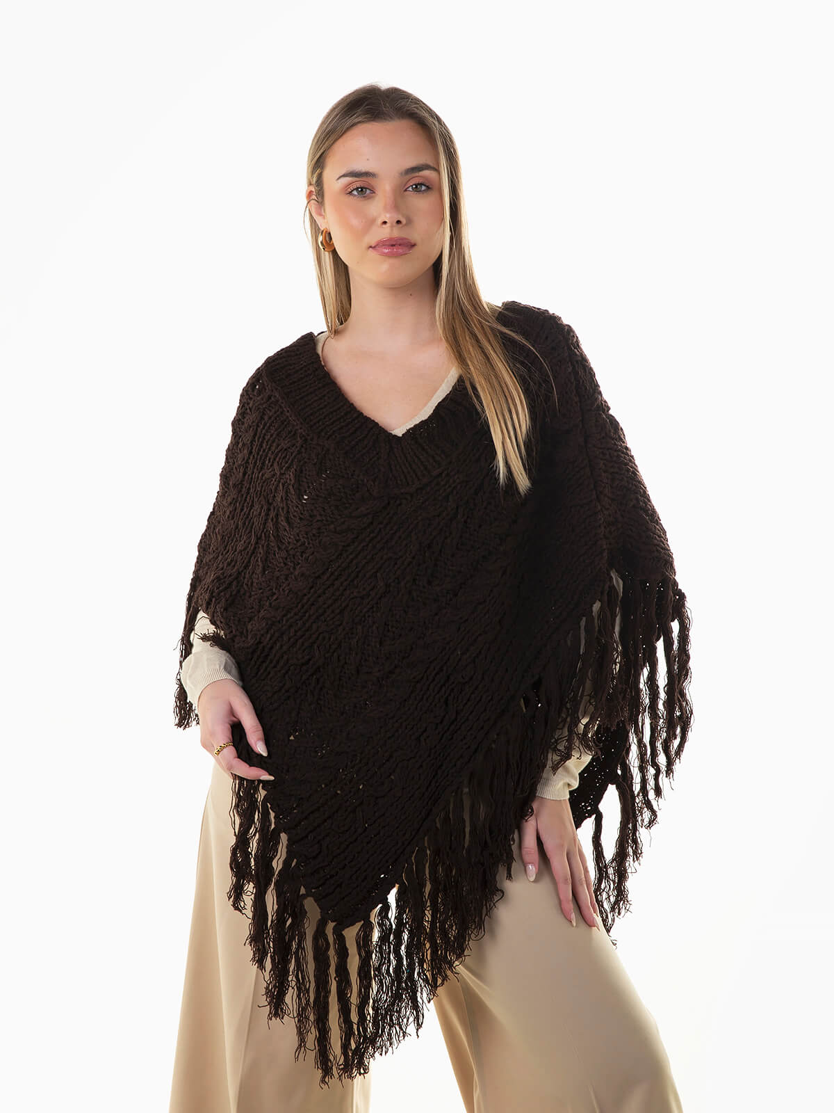 Poncho de malha trançada com extremidades em franjas. Poncho com decote em V.