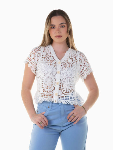 Quimono comprido em crochet para senhora. Casaco com manga 3/4 e decote em bico. Aperto de cordão.