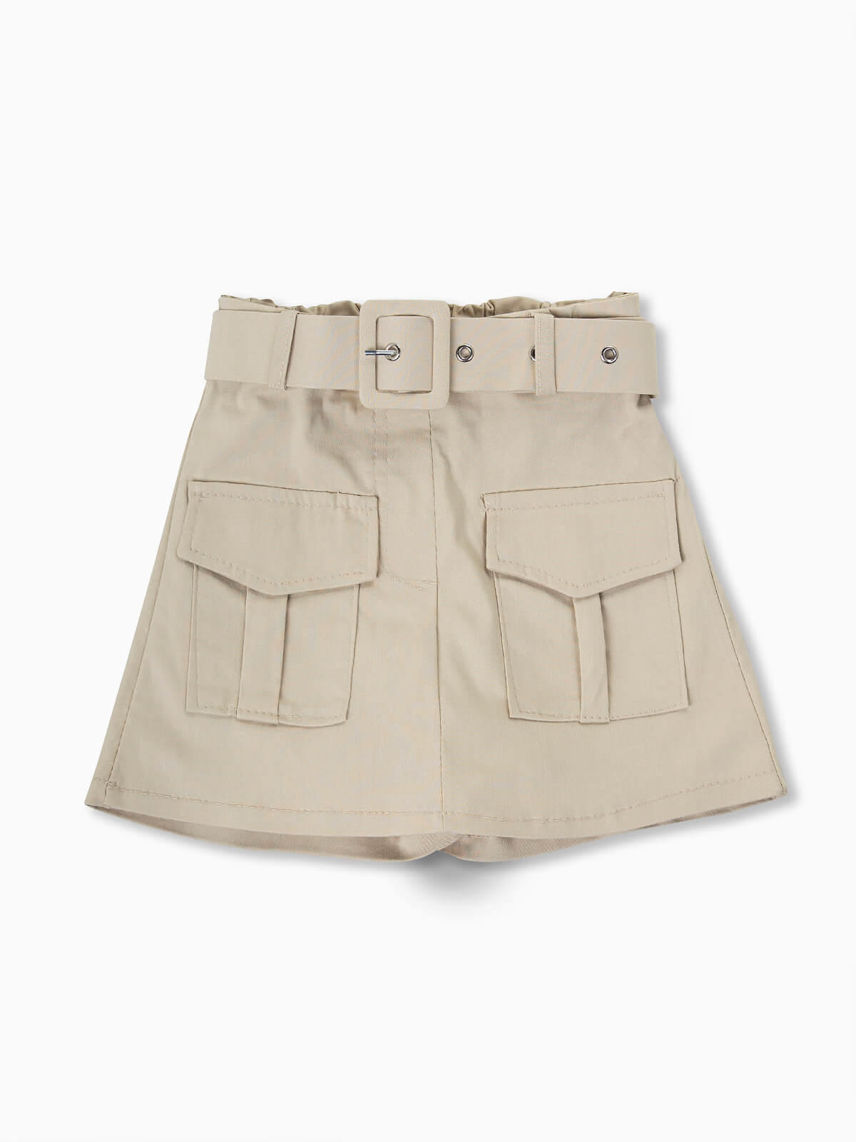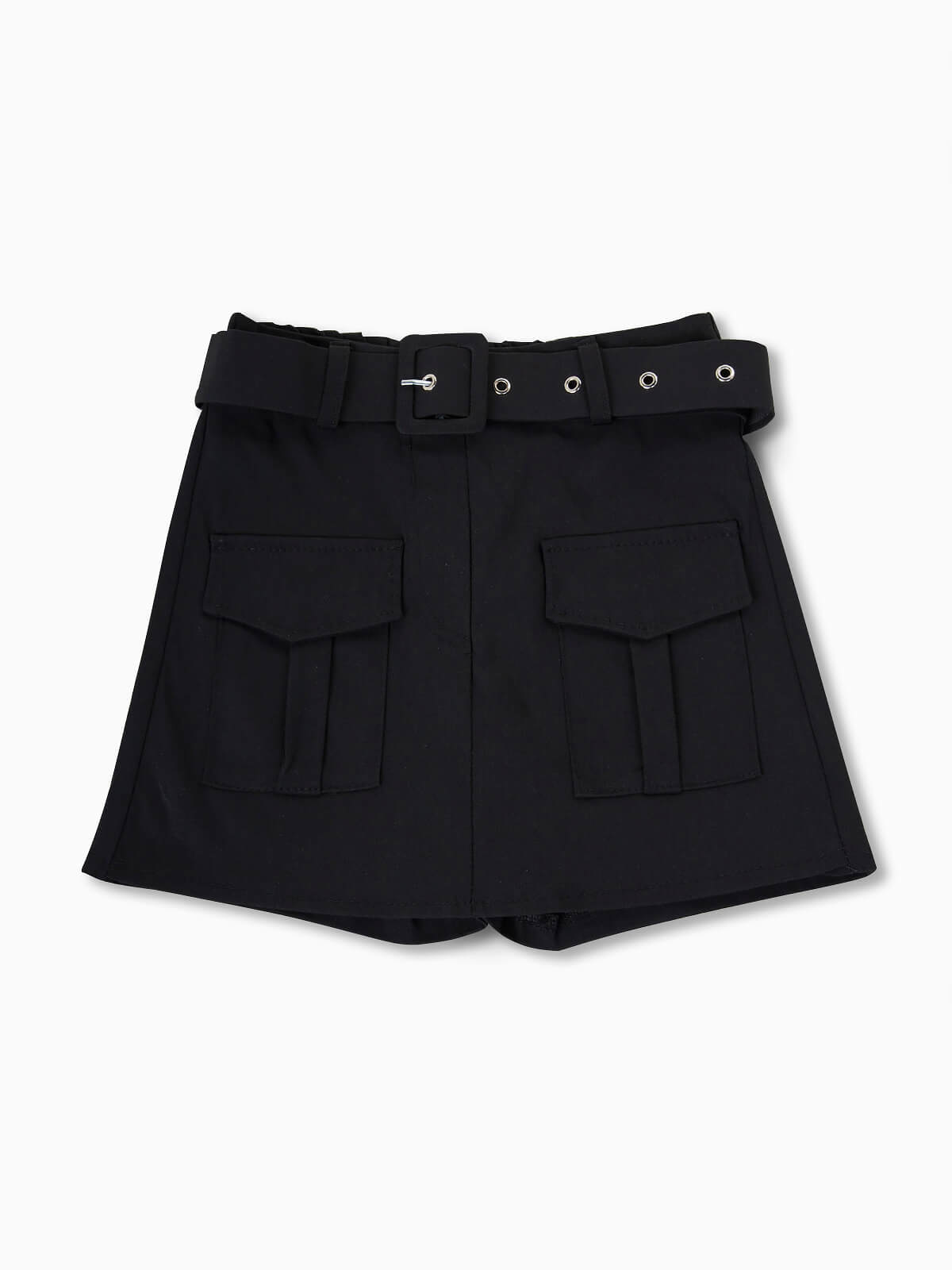 Saia-calção com 2 bolsos quadrados à frente. Saia curta em tecido elástico com cintura elástica. Cinto removível.