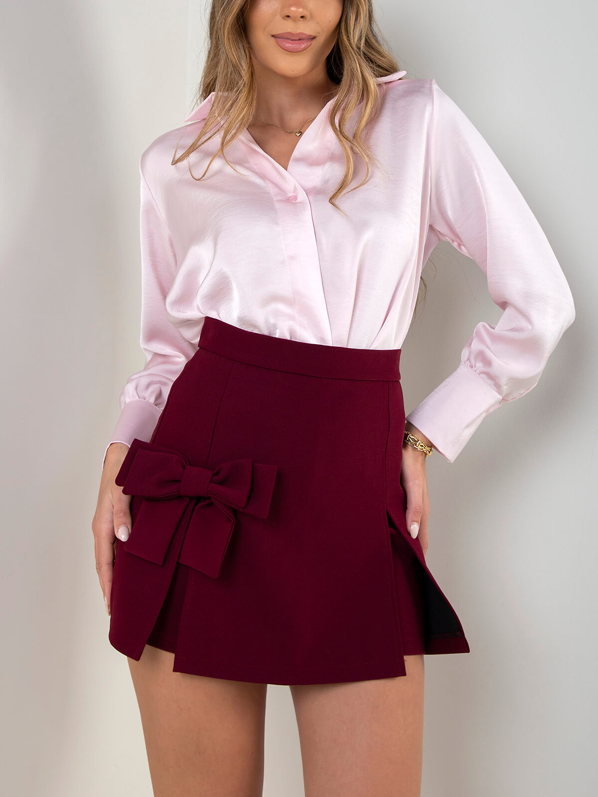 Saia-calção com design cruzado frontal e aplicação de laço decorativo. Modelo com fecho posterior invisível. Ideal para looks elegantes e para o trabalho.