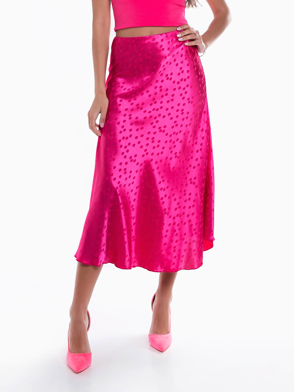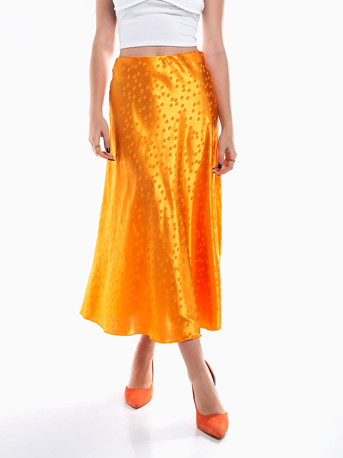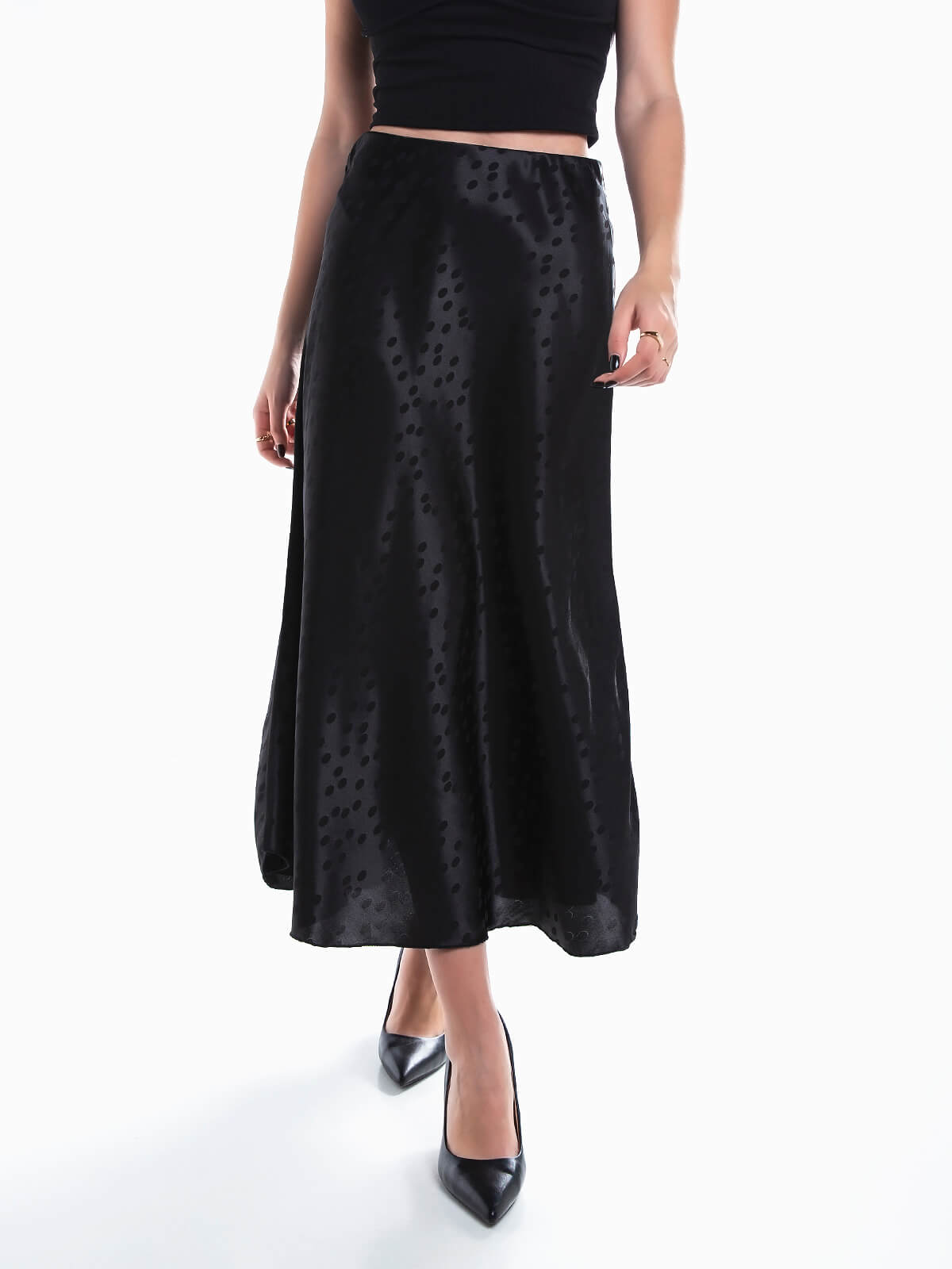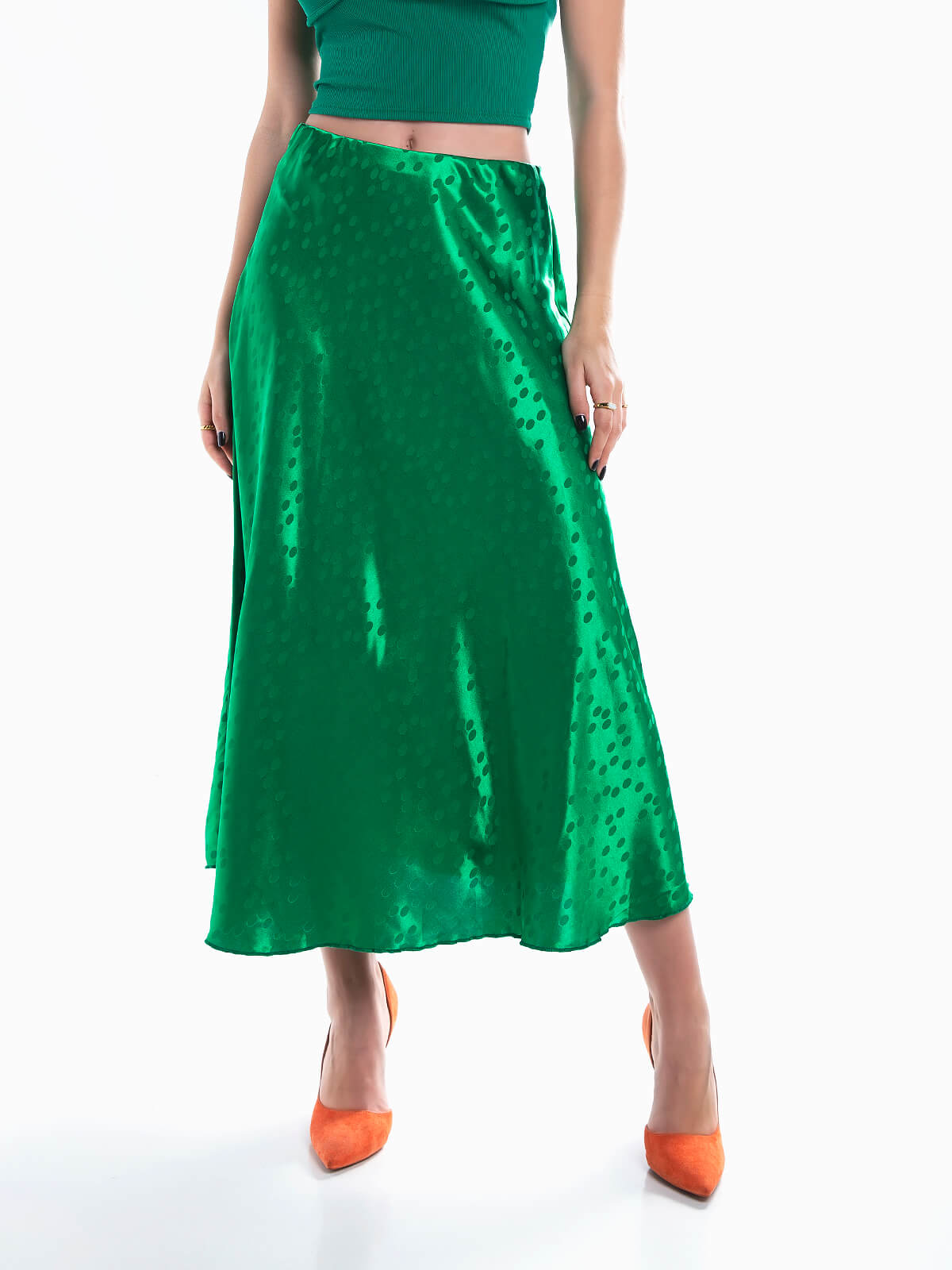Saia comprida acetinada às bolas para senhora. Saia de cintura alta elástica. Tecido leve e fluído.
