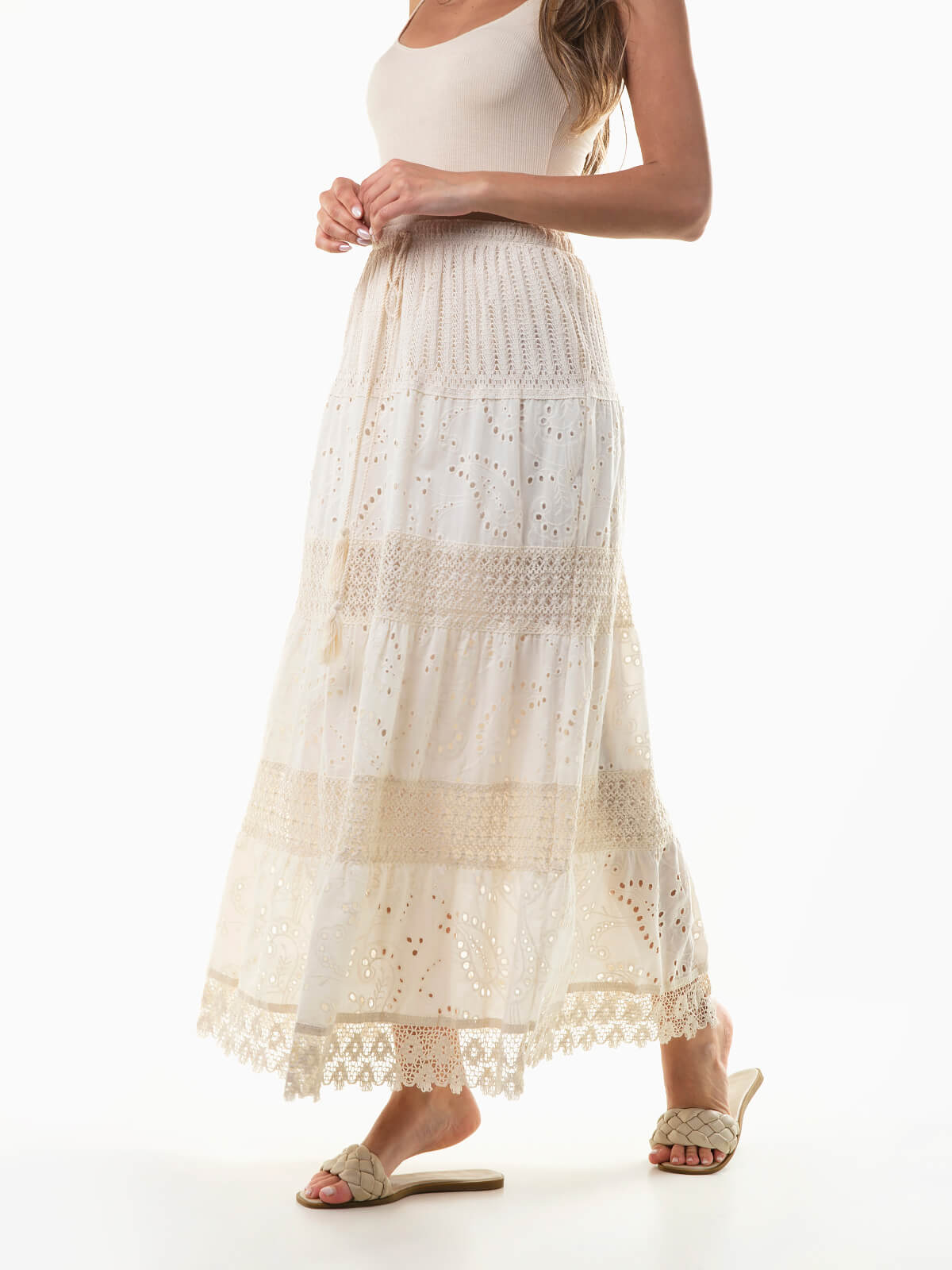 Saia comprida com bordado inglês e renda para mulher. Saia boho fluída de cintura alta e com cordão para ajustar. Interior forrado.