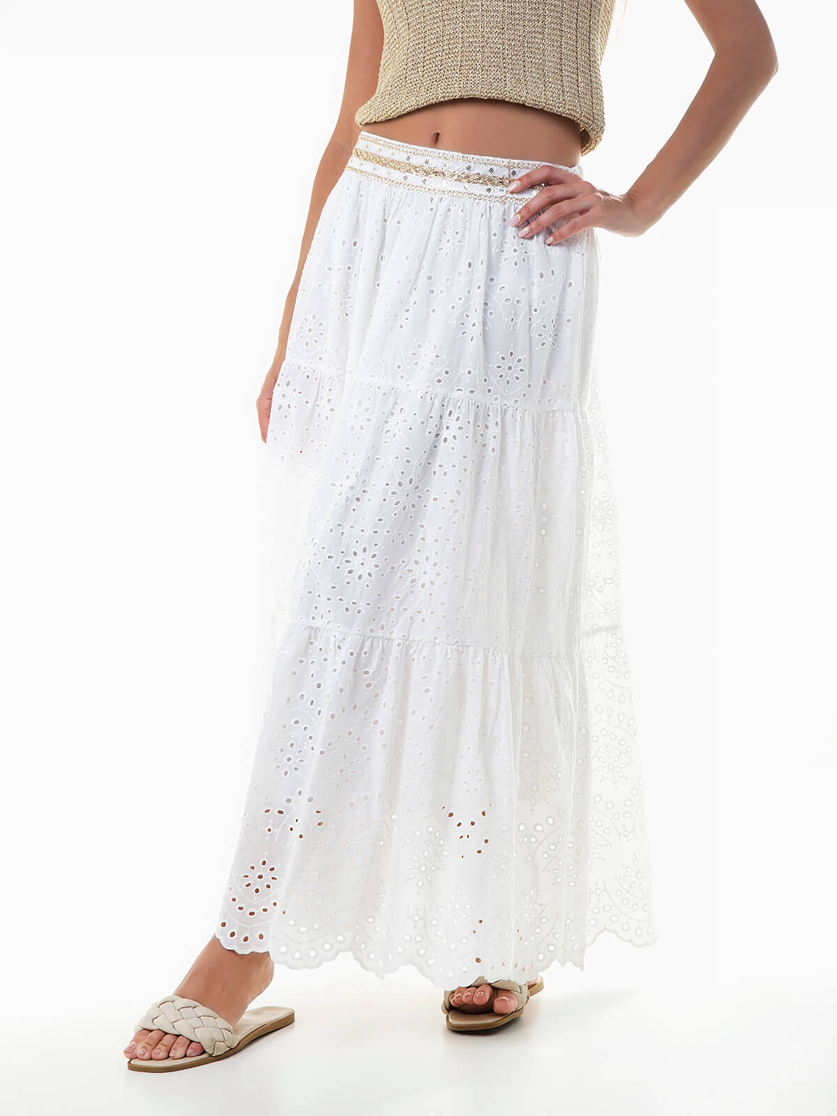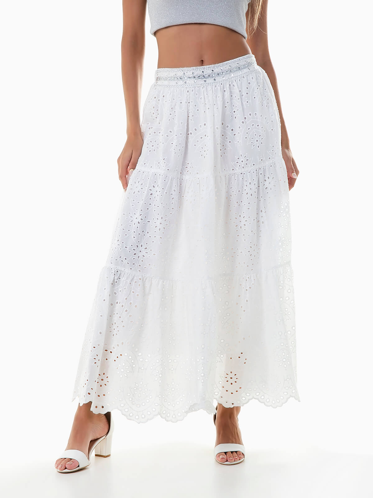 Saia comprida em tecido bordado inglês com interior forrado. Saia com cintura elástica e pormenores de lantejoulas. Base recortada.