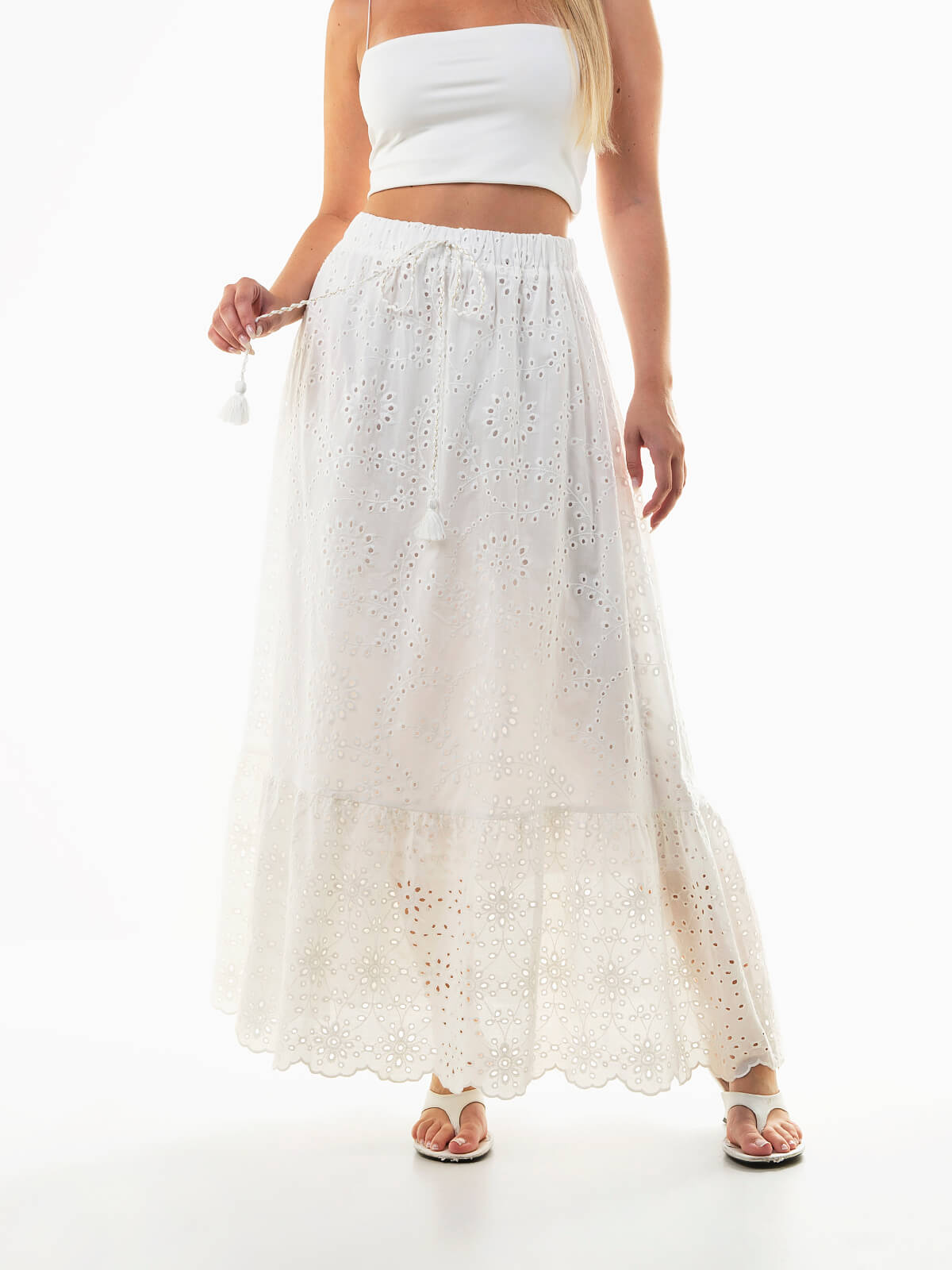 Saia comprida em bordado inglês, com cintura alta elástica para maior conforto. Modelo feminino com painel aplicado na base e cordão com laço decorativo. Um essencial de verão que combina romantismo e leveza. Conjuga com um top cropped em malha ou uma blusa leve para um look fresco e cheio de charme nos dias quentes.