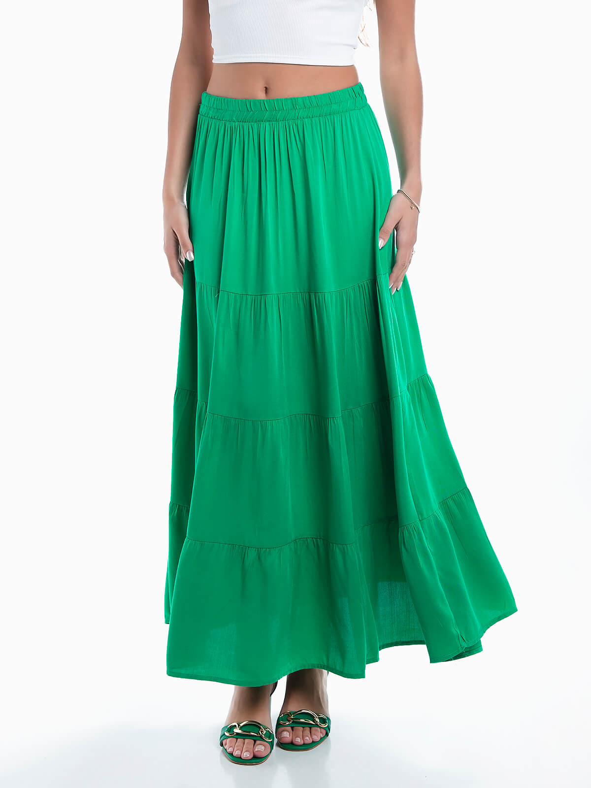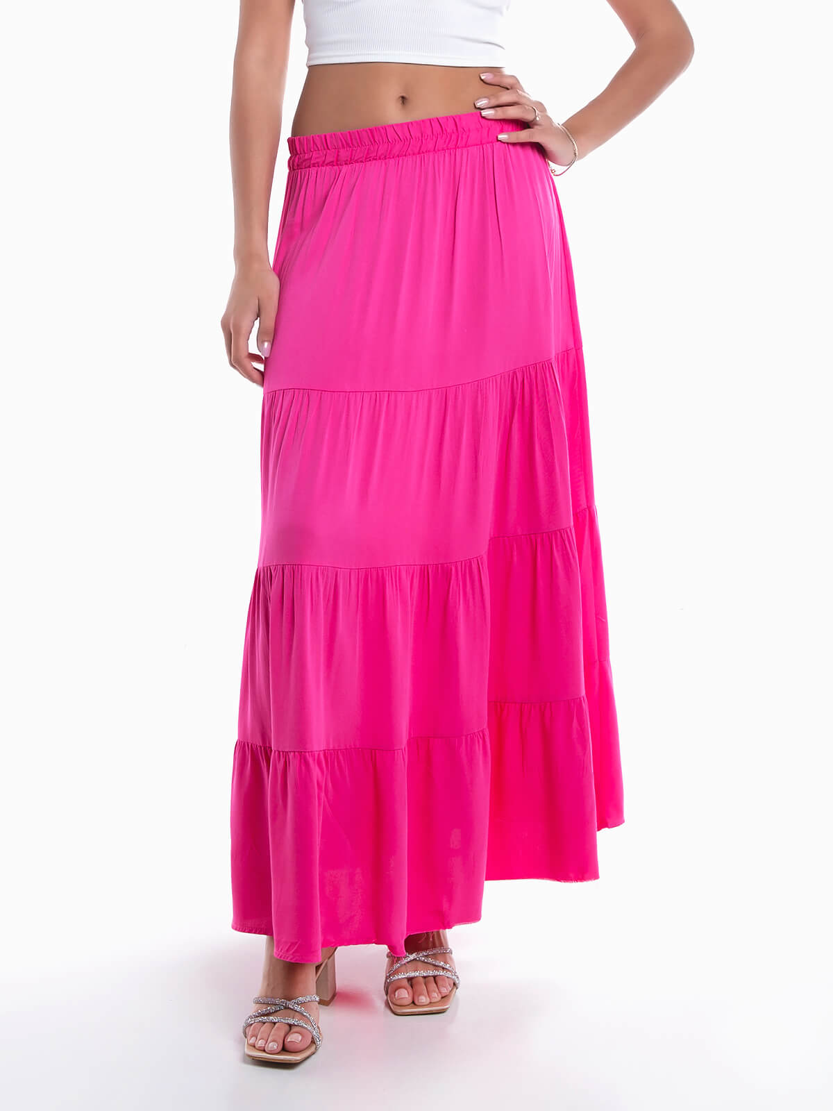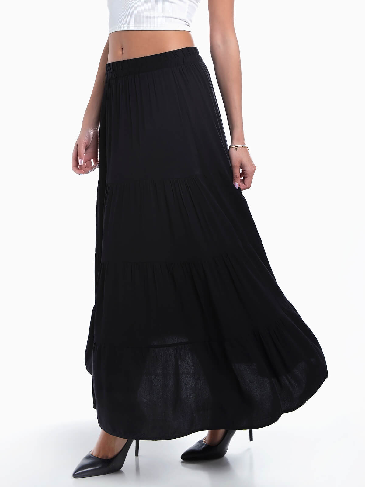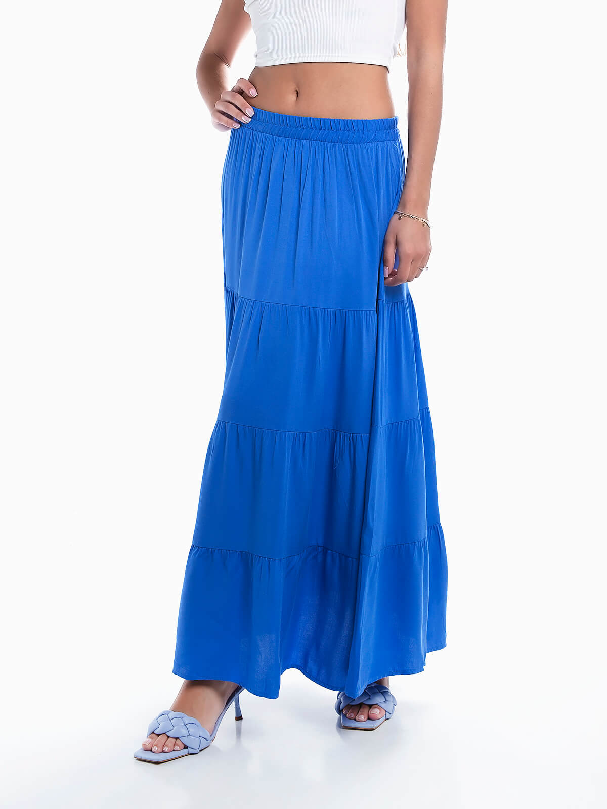 Saia comprida com encaixe de folhos. Saia fluída de cintura baixa elástica.