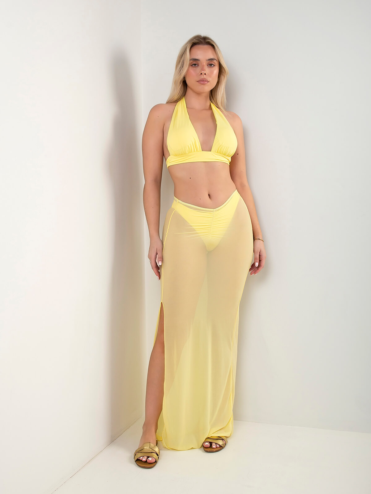 Saia comprida em tule amarelo, ideal para combinar com biquínis e criar looks de praia mais completos. Modelo de cintura subida com efeito franzido na parte frontal, que acompanha o corpo de forma fluída. Apresenta racha lateral para maior movimento e leveza, perfeita para usar por cima do fato de banho.