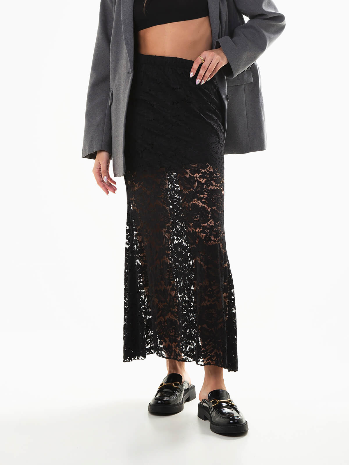 Saia preta comprida de renda com forro curto. Saia de cintura alta elástica.