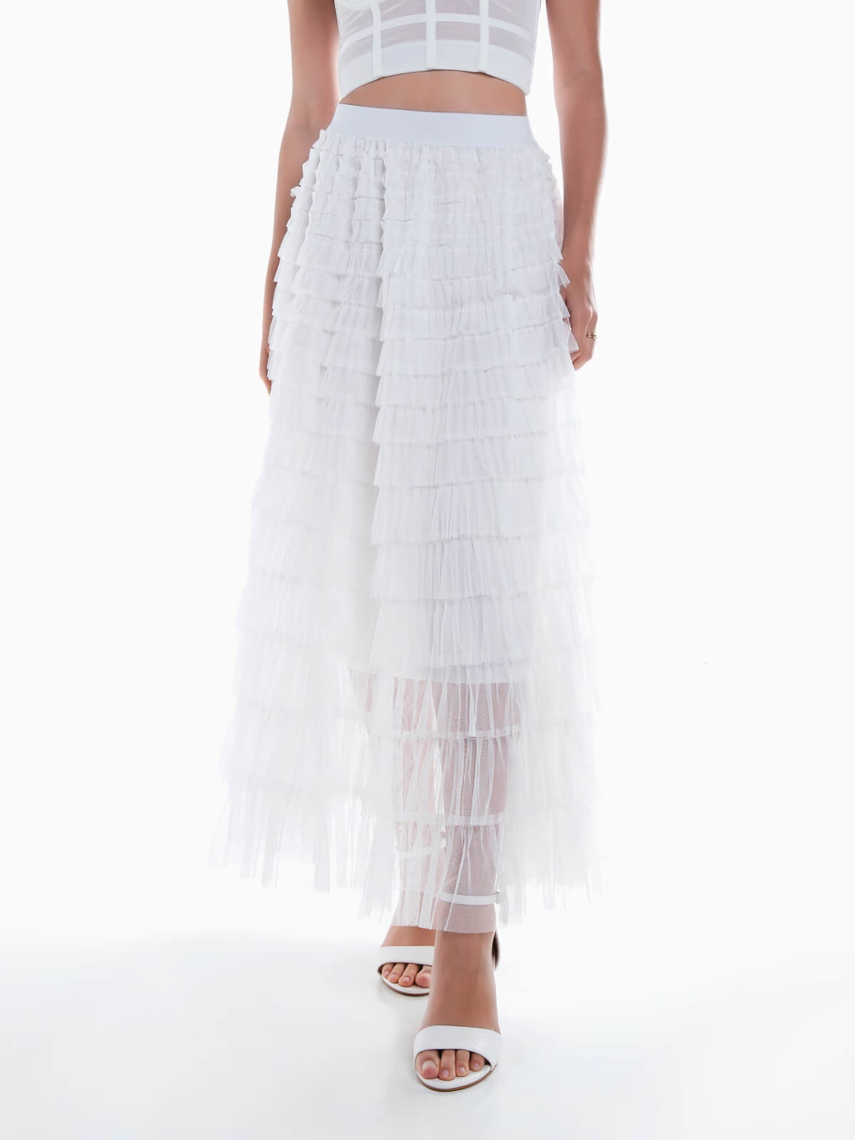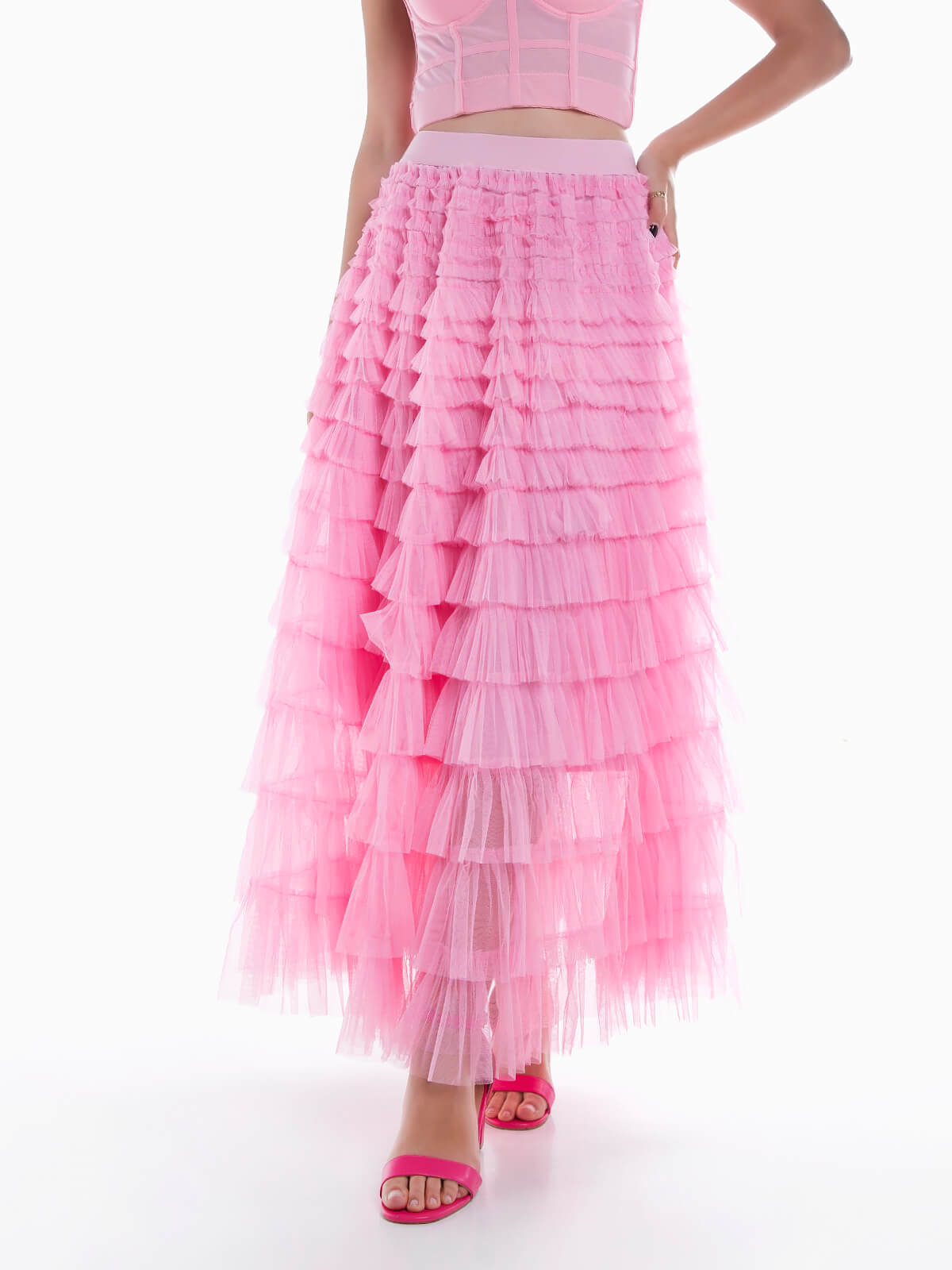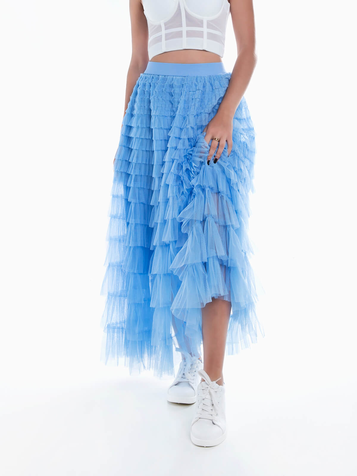 Saia de tule comprida com folhos sobrepostos para senhora. Saia com cintura alta elástica. Interior forrado.