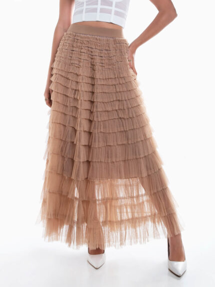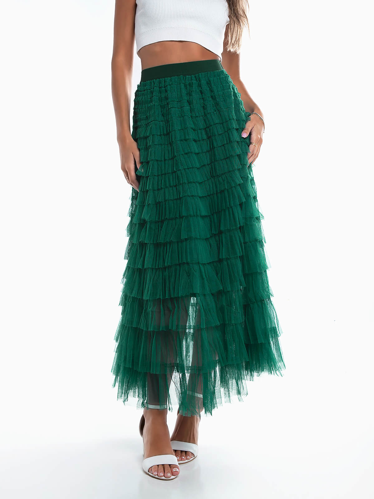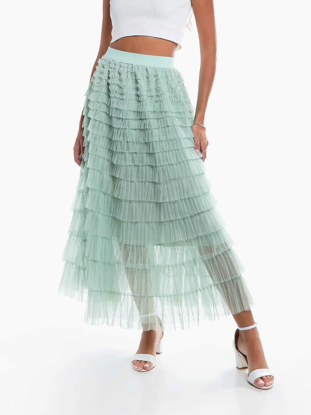 Saia de tule comprida com folhos sobrepostos para senhora. Saia com cintura alta elástica. Interior forrado.