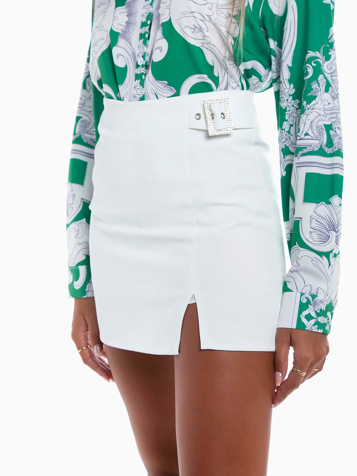 Saia curta com abertura à frente. Saia de cintura alta com forro em calção para maior conforto. Cintura alta. Pormenor de fivela com jóias. Aperto lateral de fecho éclair.