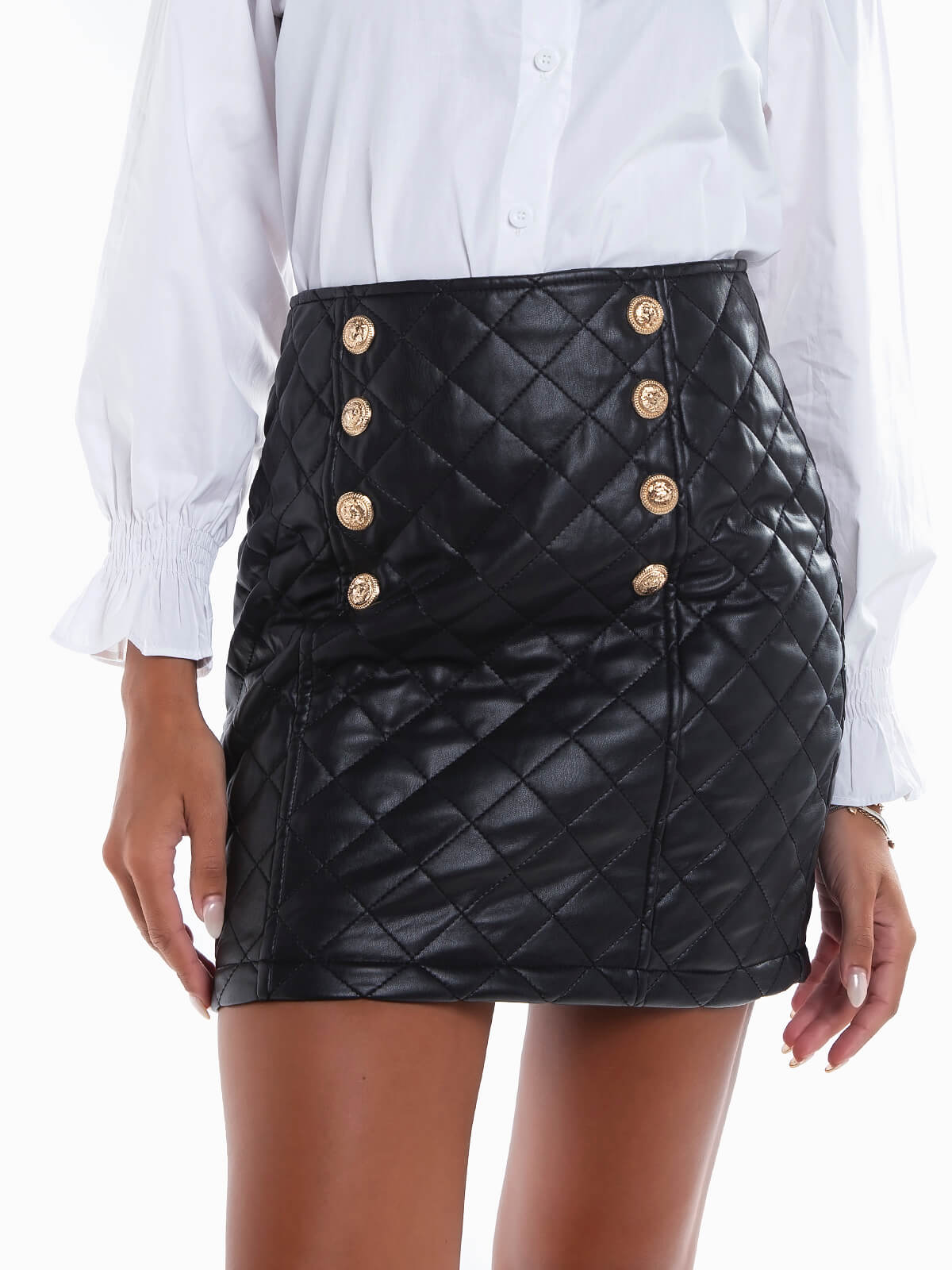 Saia curta efeito pele com botões dourados aplicados. Saia de cintura alta com interior forrado e aperto posterior fecho éclair.