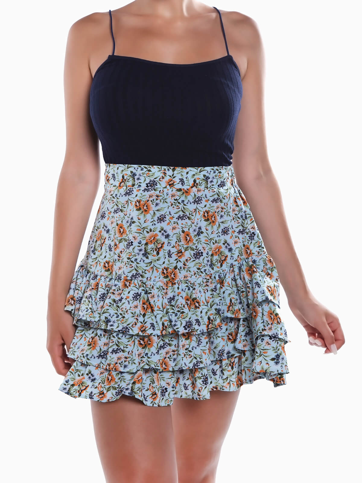 Saia curta floral com folhos aplicados na base. Saia de cintura alta elástica.