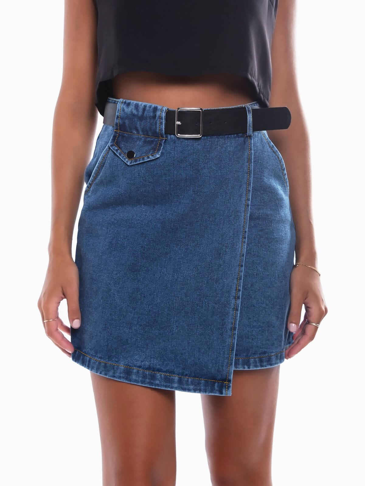 Saia curta ganga com cinto em pele sintética. Saia de cintura alta com efeito de trespasse. 2 bolsos. Aperto de fecho éclair oculto atrás.