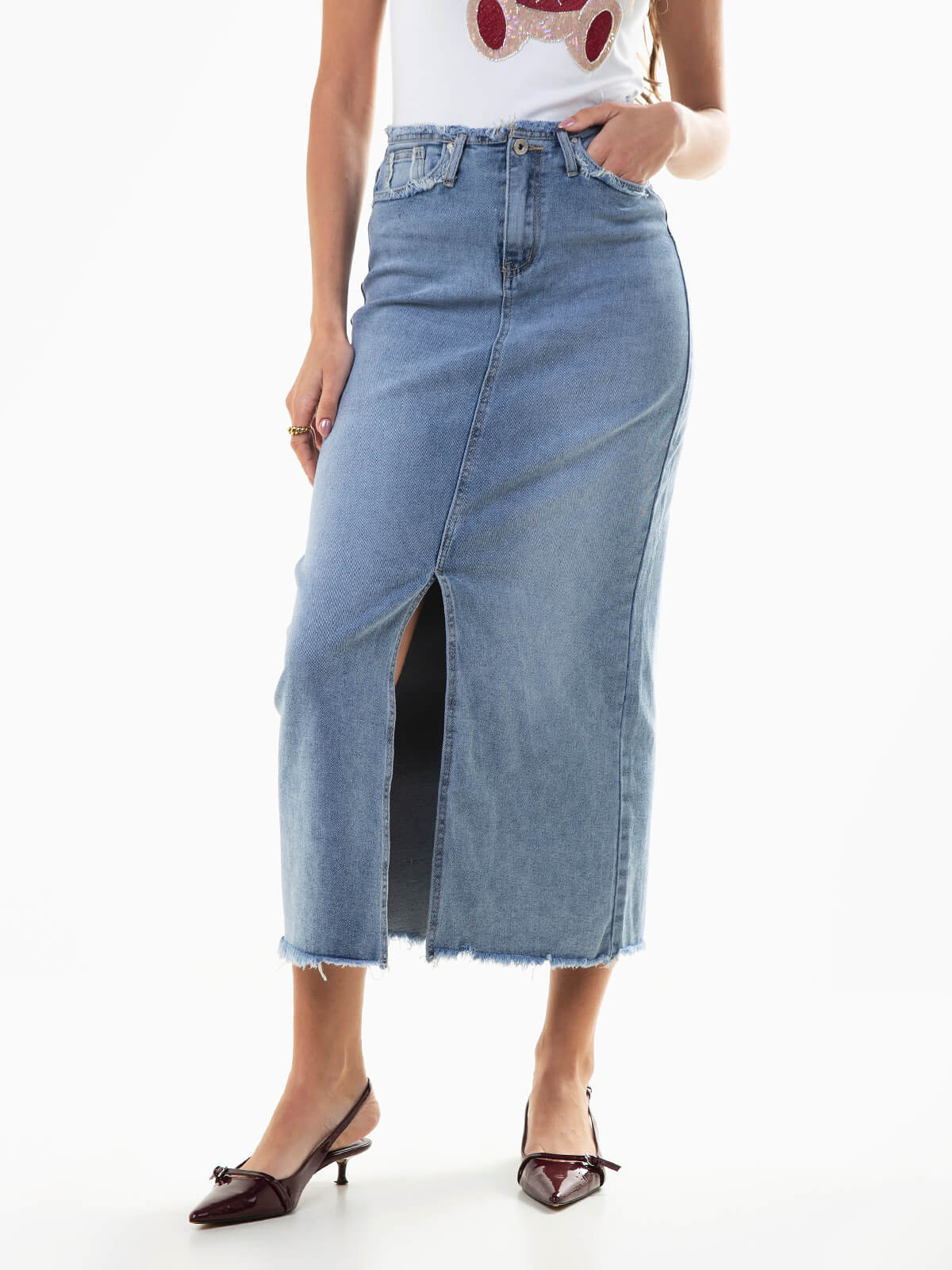 Saia ganga midi com extremidades desfiadas para mulher. Saia de cintura média com abertura na base. 5 bolsos. Aperto fecho éclair e botão.