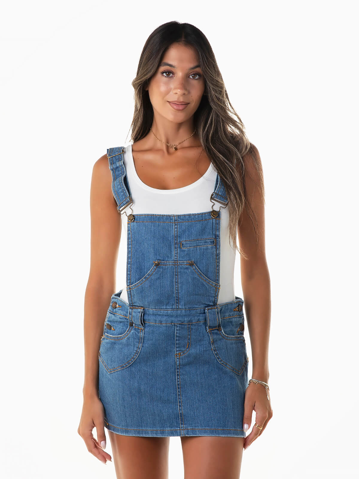 Saia jardineira de ganga para senhora. Jardineiras curtas com alças ajustáveis e bolso canguru. 4 bolsos. Aperto lateral de botões.