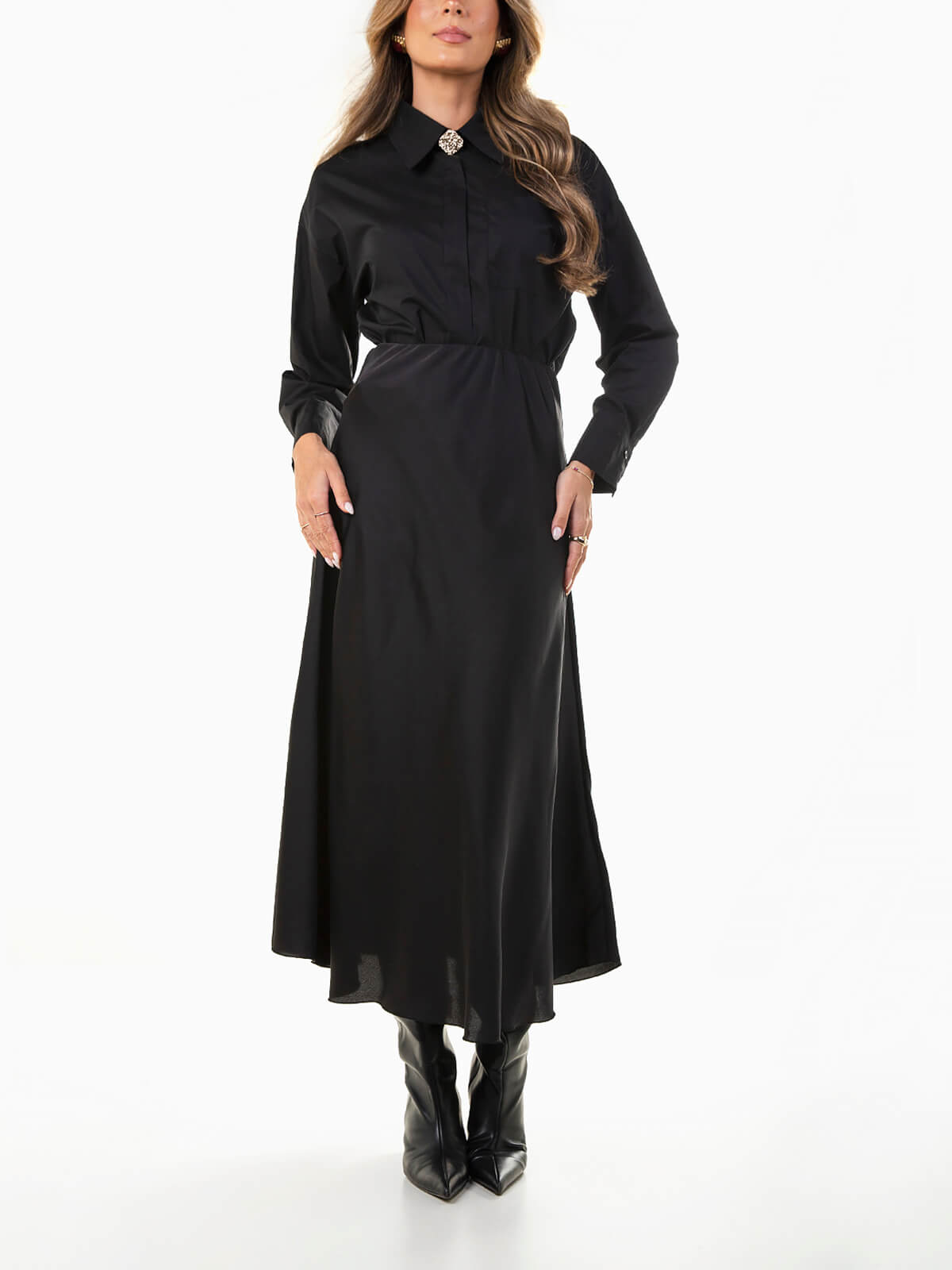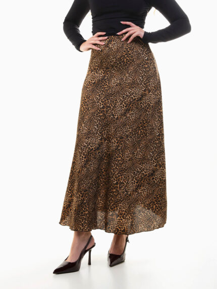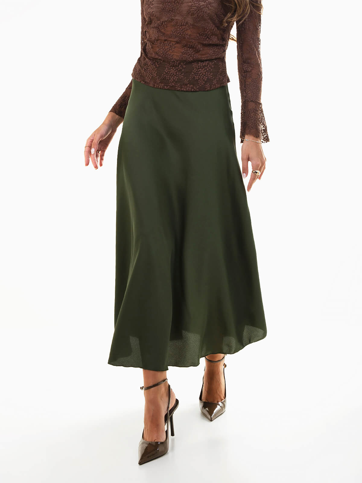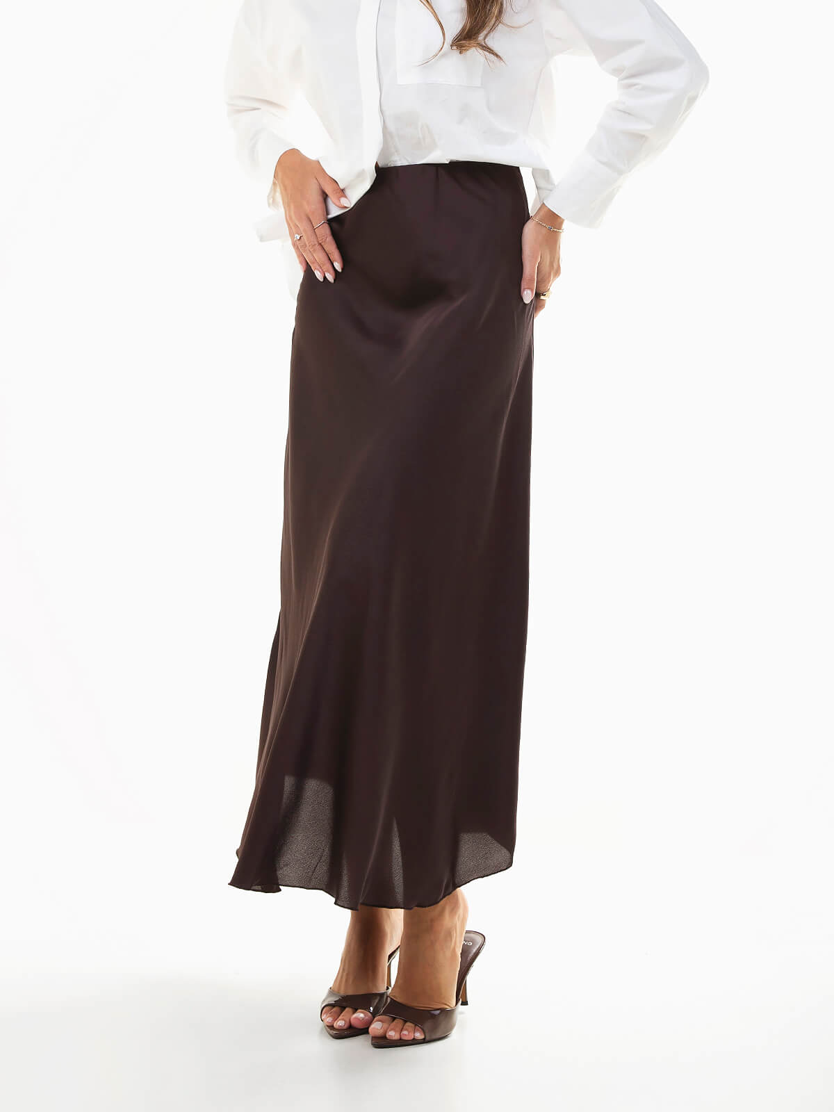 Saia midi em tecido acetinado liso, com corte evasé e cintura alta, oferecendo movimento fluido e conforto. Uma peça versátil que combina com tops lisos ou estampados, ideal para looks elegantes do dia a dia ou ocasiões especiais.