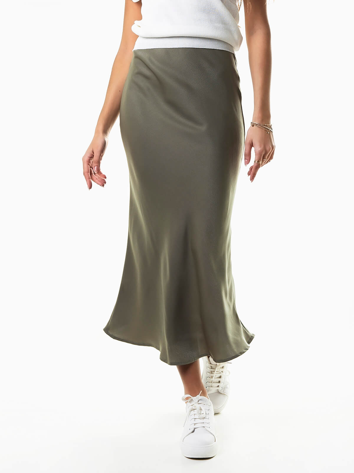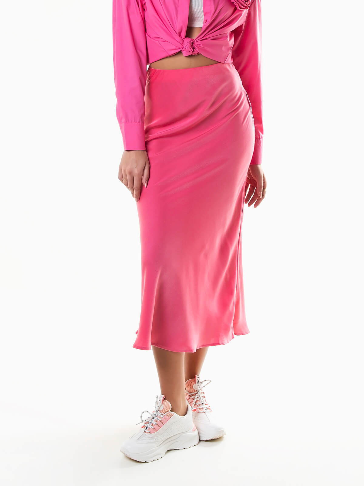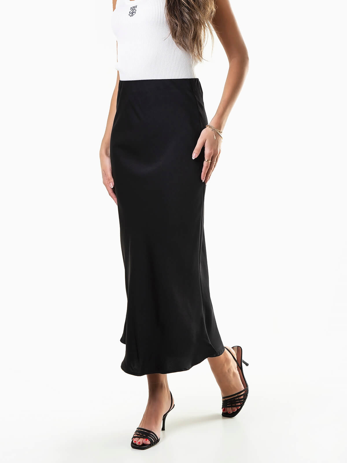 Saia midi acetinada para senhora. Saia de cintura alta com cós elástico.
