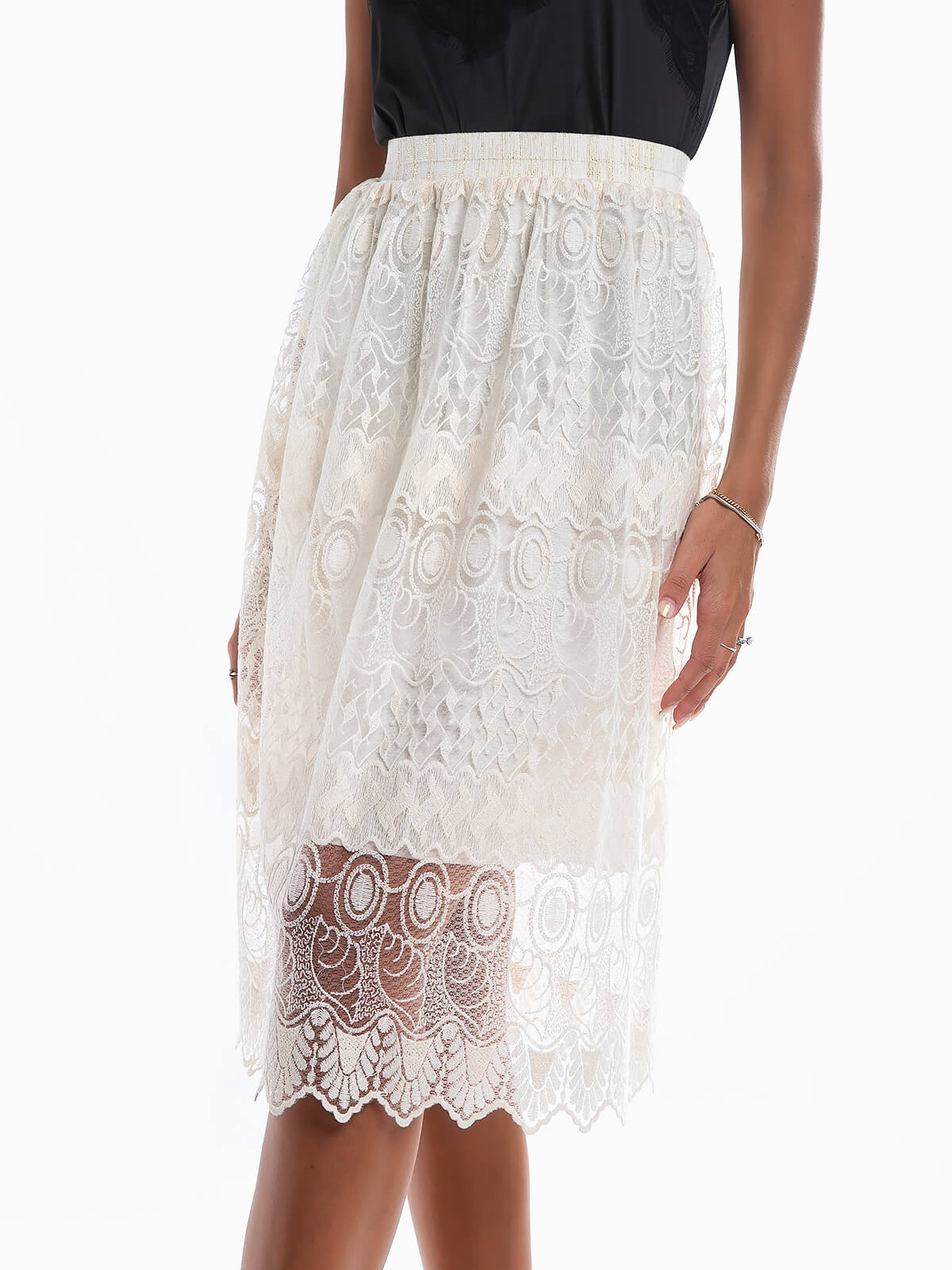 Saia midi bege rendilhada com interior forrado. Saia de cintura alta elástica com pormenores em fios lurex para acabamento brilhante.