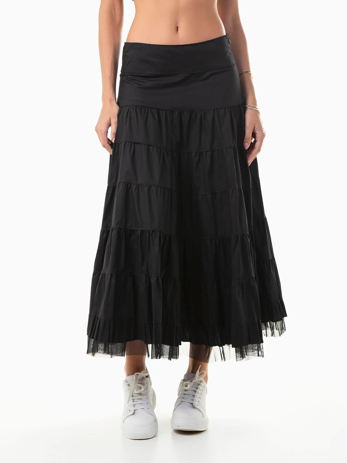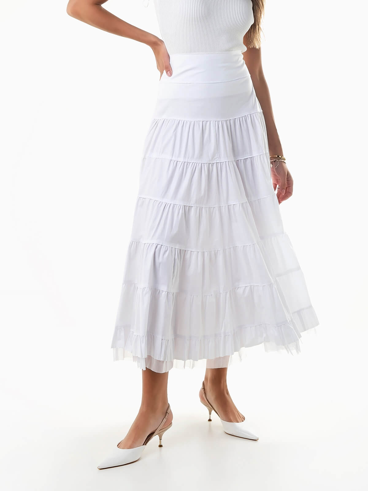 Saia midi com seções para criar um efeito mais volumoso. Saia de cintura alta com aperto fecho zíper oculto na costura. Sem forro. Encaixe de tule na base.