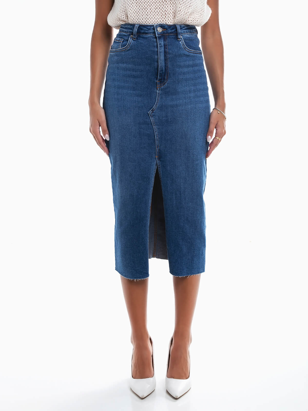 Saia midi de ganga com abertura para senhora. Saia elástica de cintura alta lavagem azul médio com 5 bolsos. Aperto de fecho éclair e botão. Base desfiada.