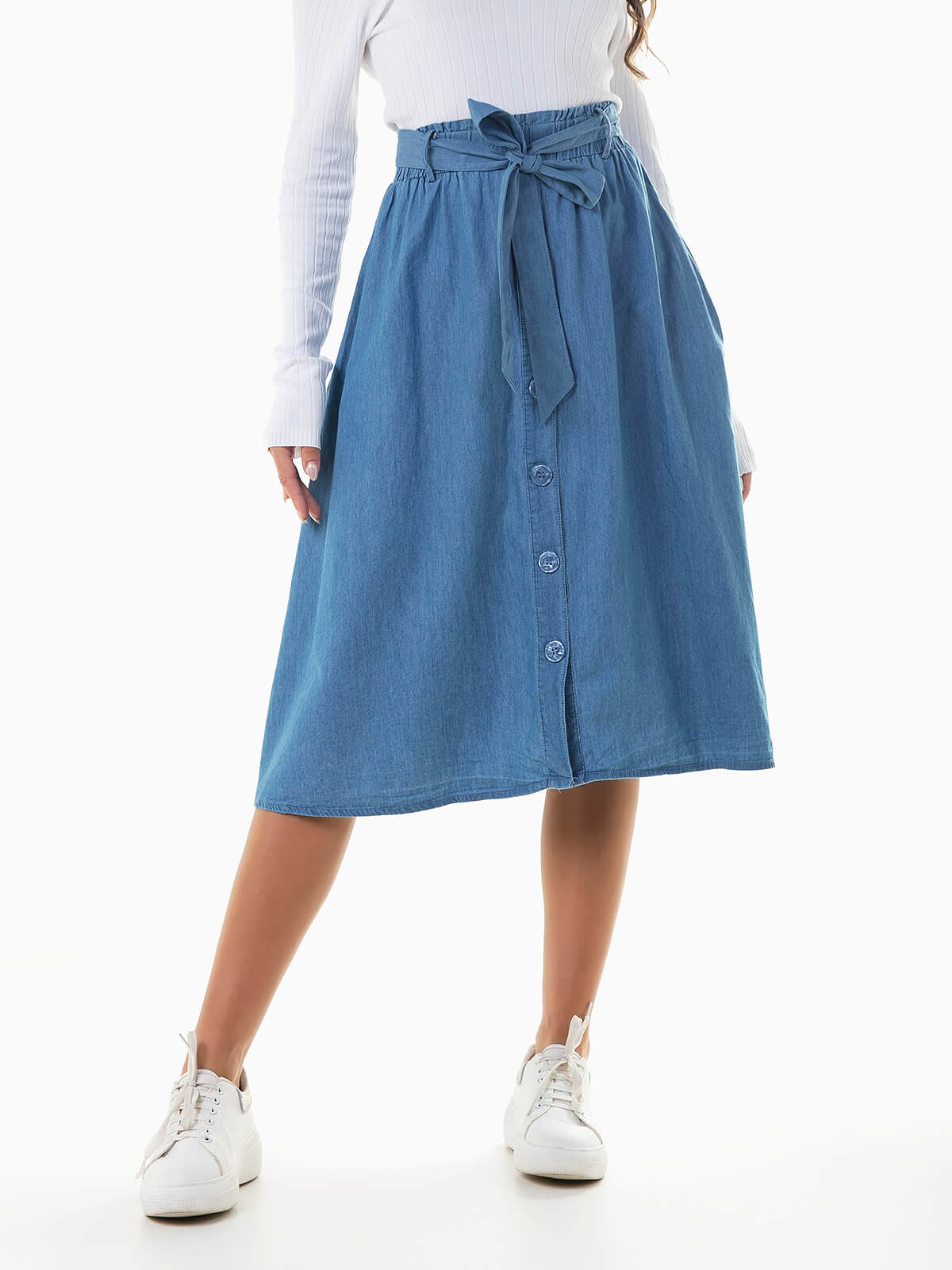 Saia midi ganga com cinto para laço removível. Saia de corte evasé com cintura alta elástica e 2 bolsos. Aperto de botões.